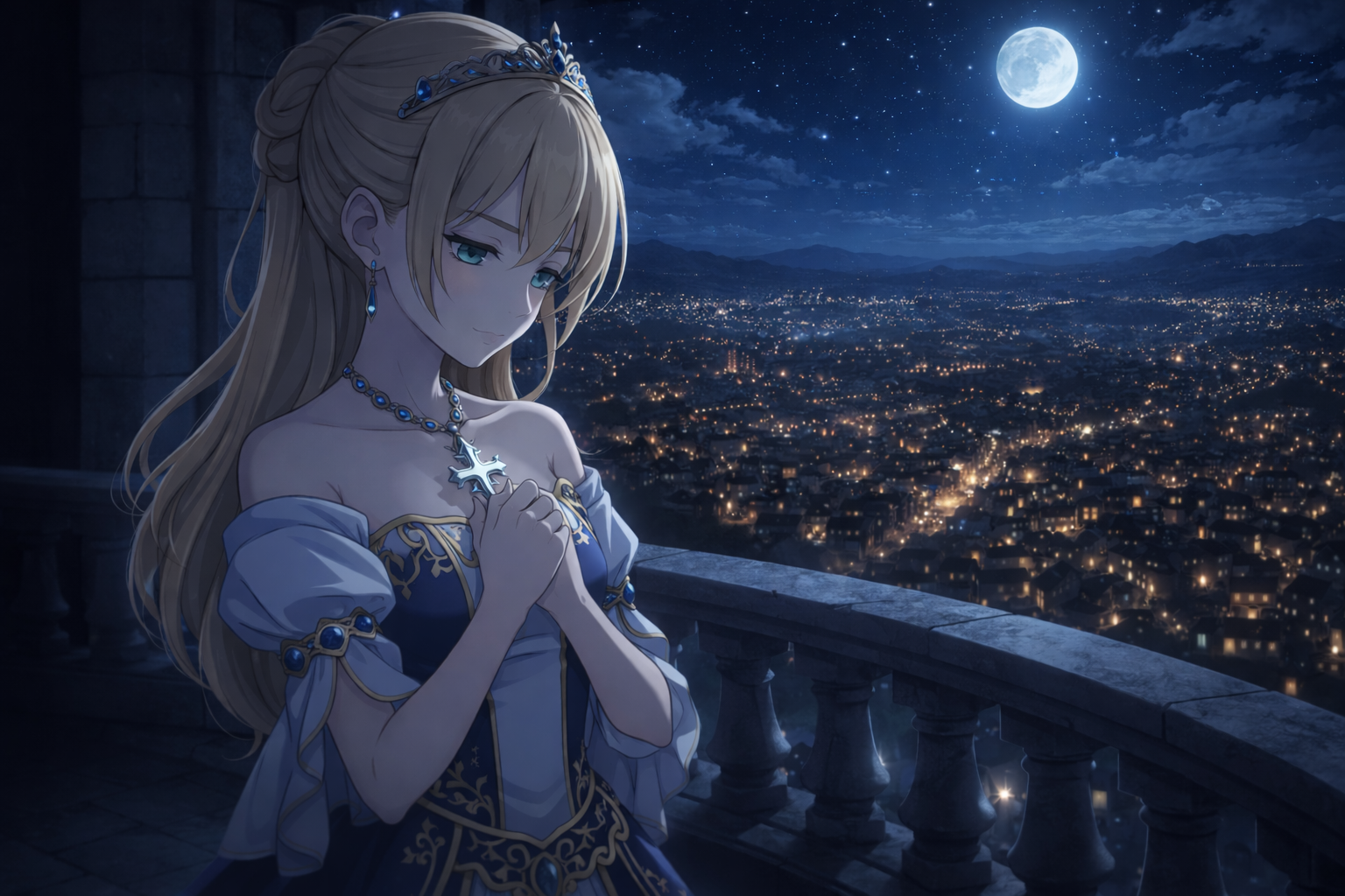 皇城のバルコニーに一人立つセシリアは、胸元のロザリオをそっと握りしめていた。
