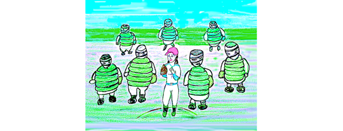 で、いよいよ試合が始まると、ワイルドビートの各打者たちは得意のビートの効いた打棒(!)どころか、まずは「美女と青虫たち」を直視し、笑いをこらえることに精一杯だった。