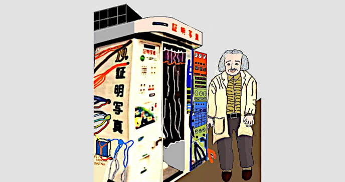 ともあれそこには魔改造された証明写真の機械がどーんと置いてあり、その傍らに、豪快に黄ばんだ白衣を着た、アインシュタインのような風防の人物が私たちを出迎えてくれた。