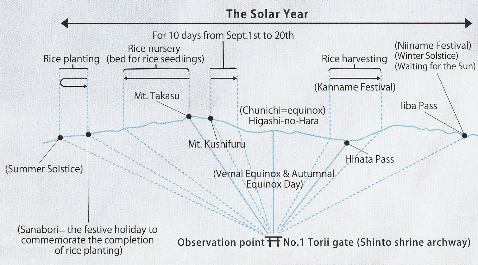 ちなみに、ここの東側に連なる高祖山系の峰々における日の出の位置が「田植え」や「収穫」などの時期を知る目印になっていた。例えば、夏至の前後に田植えを行ない、日の出の位置が日向峠の辺りにくる頃に収穫をする――という具合である。