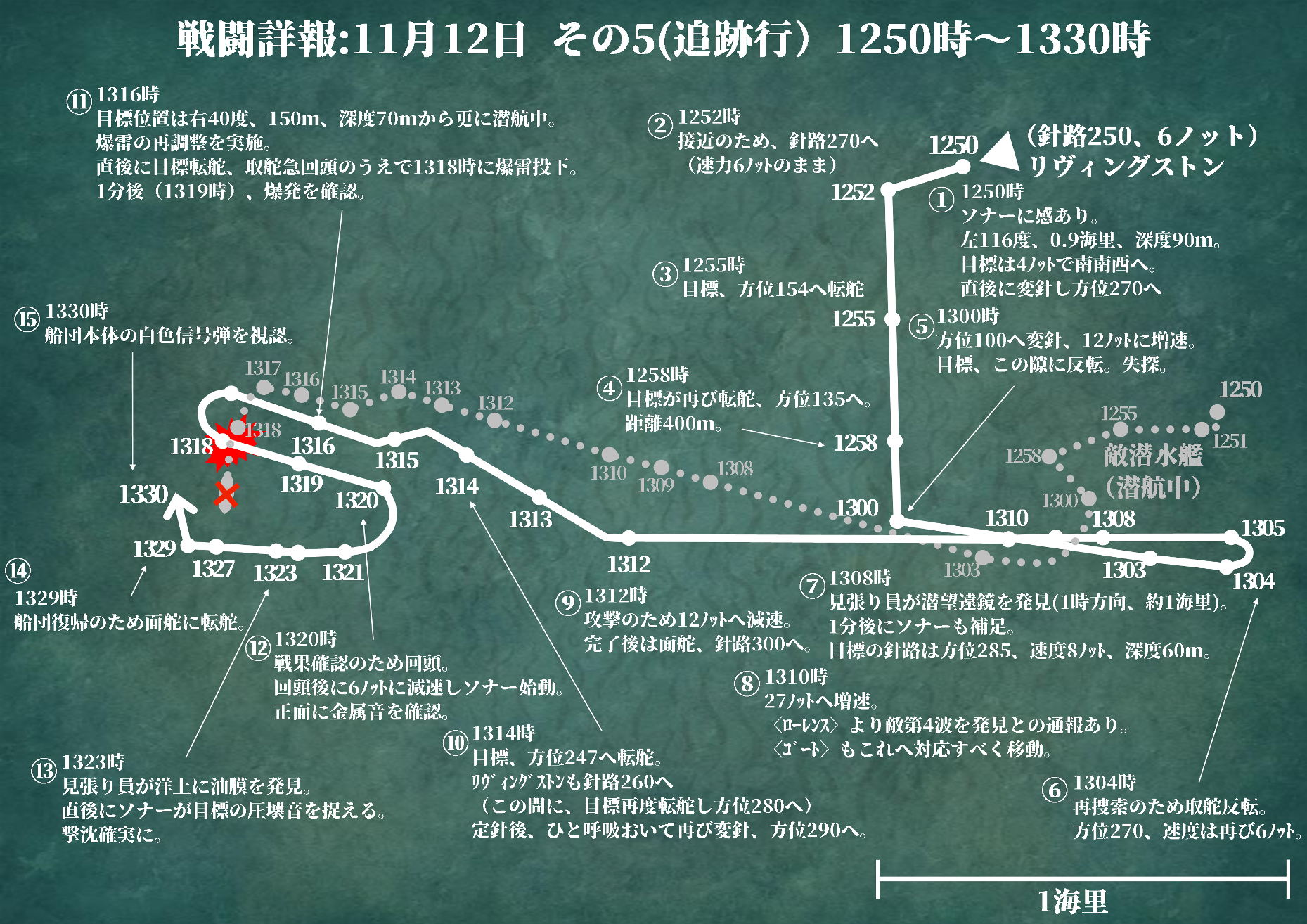 『目標は再び左舷へ変針、方位一三五へ進みつつあり。現在位置は本艦の左八〇度、約四〇〇メートル』