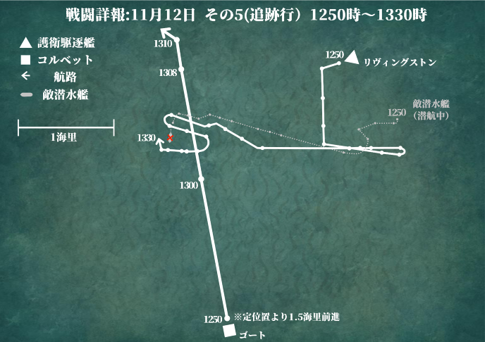 船団本隊と逆方向へ進む敵に対し、〈リヴィングストン〉はその反対、西に位置する船団を目指すコースをとっていた。速度は六ノットのままである。