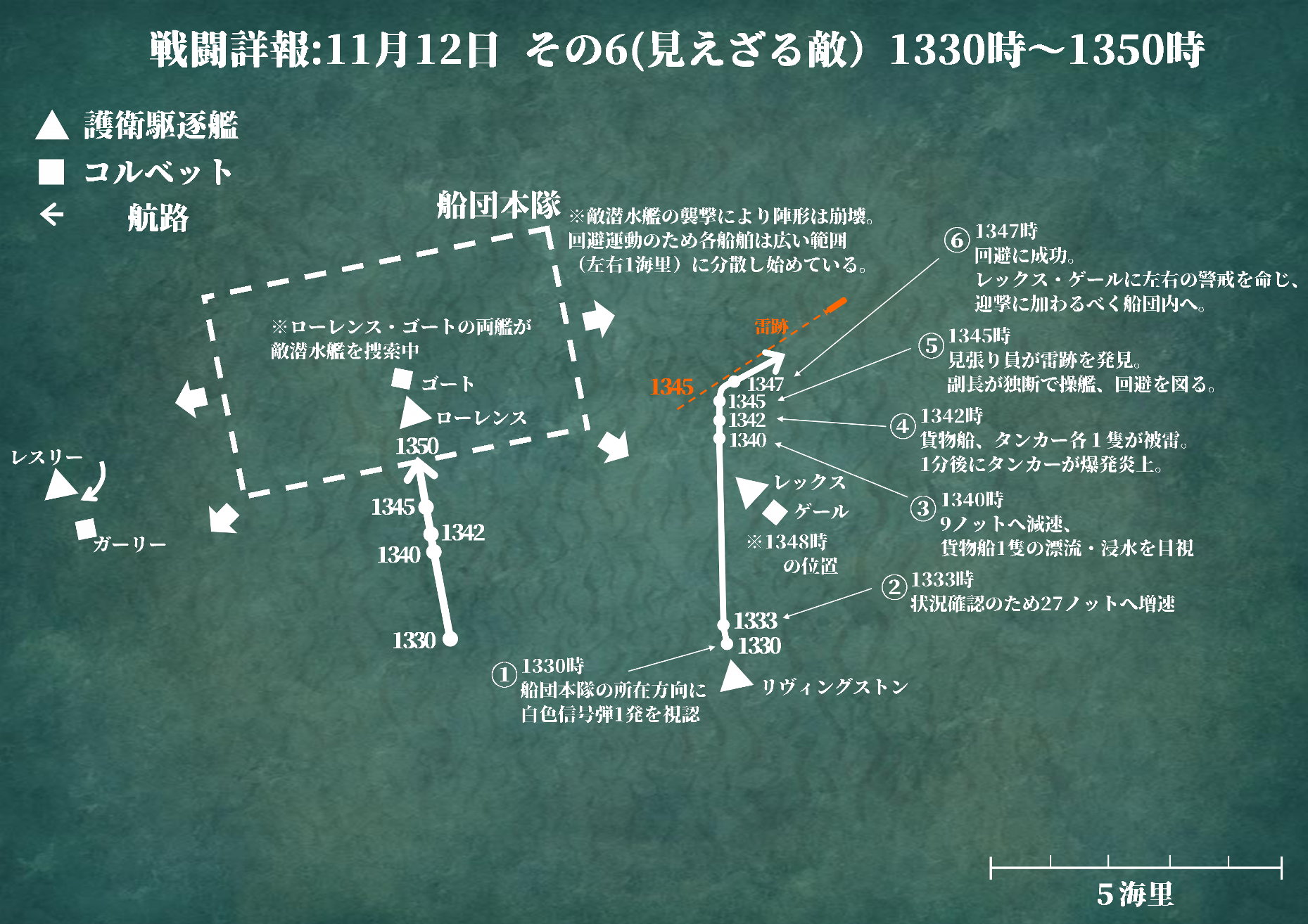 〈リヴィングストン〉の左舷側――二〇メートルはなれた位置を魚雷が通過した瞬間、彼は目を見開いて無意識に息をとめた。それは白い航跡を残して、艦のよこをスッと走り去っていった。危地を脱したことを実感して、彼は深く溜息をつく。極寒の洋上であるにも関わらず、その額にはうっすらと汗がつたっていた。