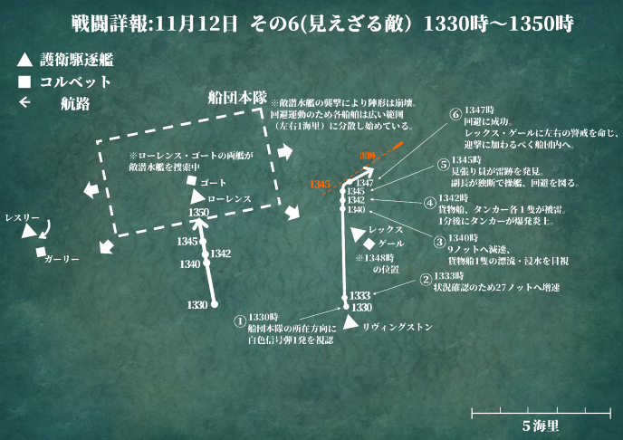 〈リヴィングストン〉らの合流が功を奏したのか、船団に新たな損害は生じなかった。一度だけ魚雷を放たれたが、幸いにも命中はしていない。だが第一〇一護衛戦隊のほうも、敵艦を撃沈するには至らなかった。