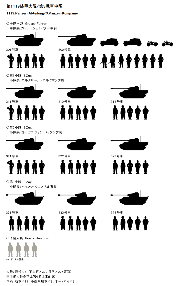 第1119装甲大隊第3中隊は、あわせて一一両の戦車からなる。内訳は中隊本部の二両と、傘下の第1~3小隊に三両ずつだ。昇進前のカールの所属先が定数二二両であったので、その半分とかなり小規模な戦力である。(といっても損耗と補充の遅れにより、実数はさほど変わらない)