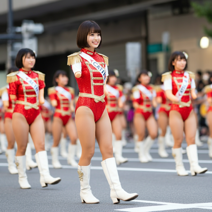 合図と共に、重低音のドラムが鳴り響き、彼女たちは一糸乱れぬ動きで前へ進む。スパンコールの衣装が陽光を反射し、通りを赤金の光で満たす。