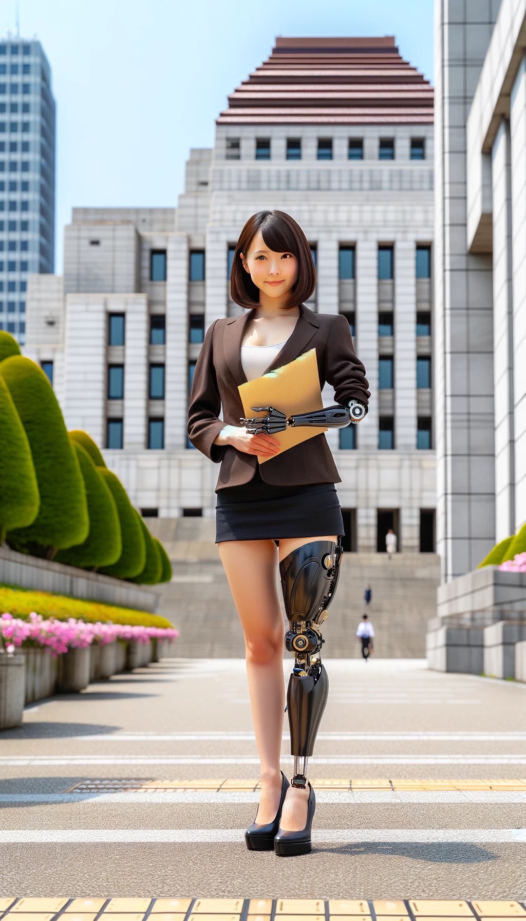 会議室に入る直前、ガラスに映る自分の姿が視界に入った。黒のジャケット、膝上のスカート、フォーマルなパンプス。そして、機械の右腕と左脚。その対比は、奇妙なほど整っていた。