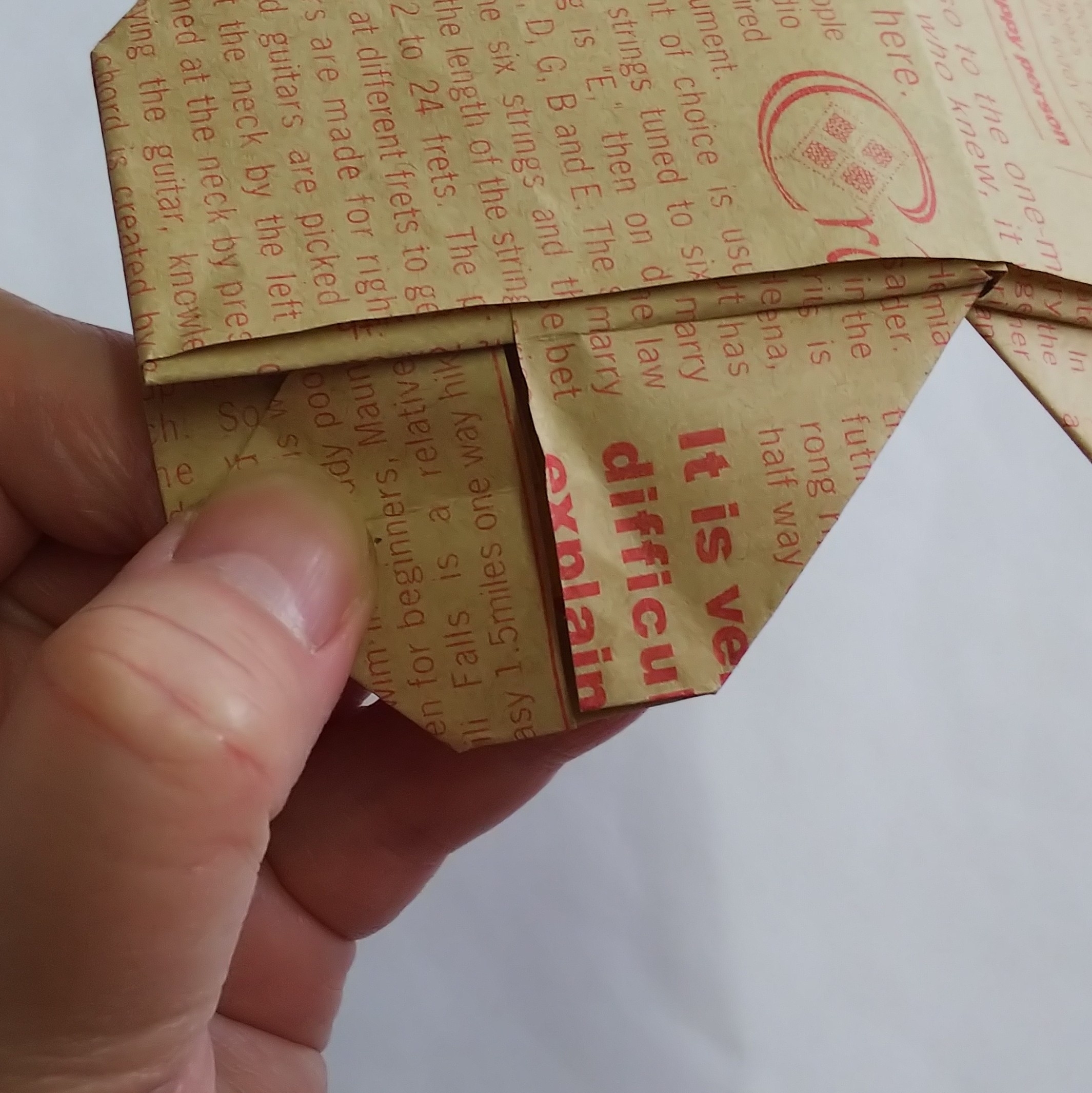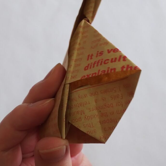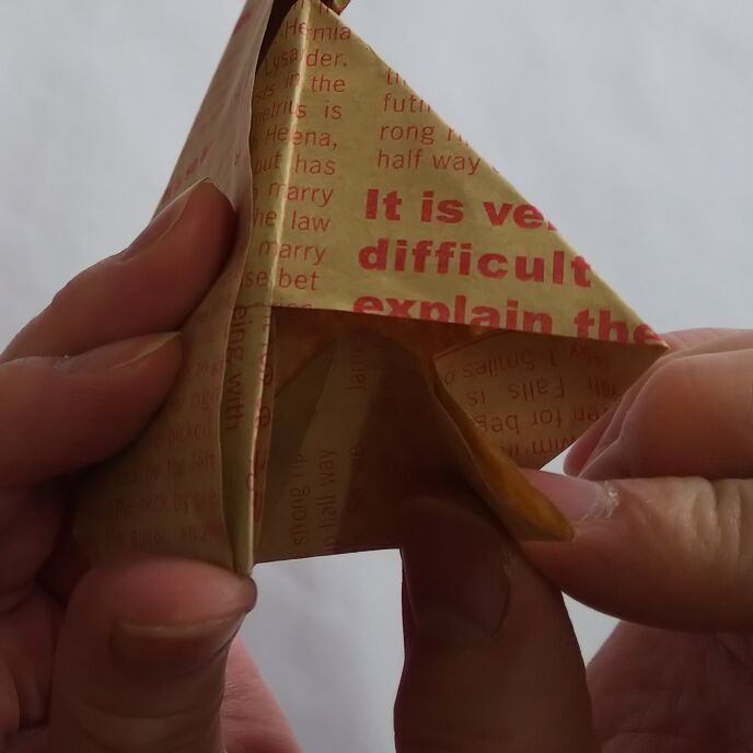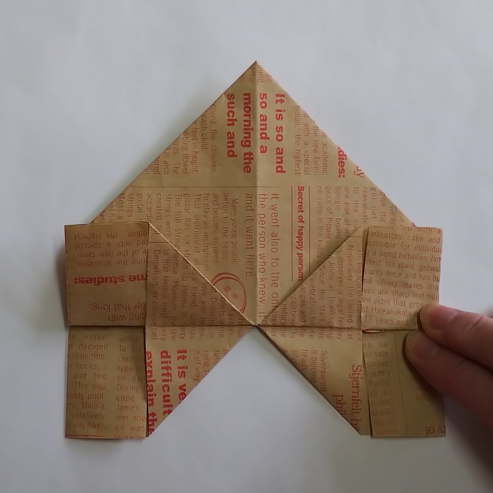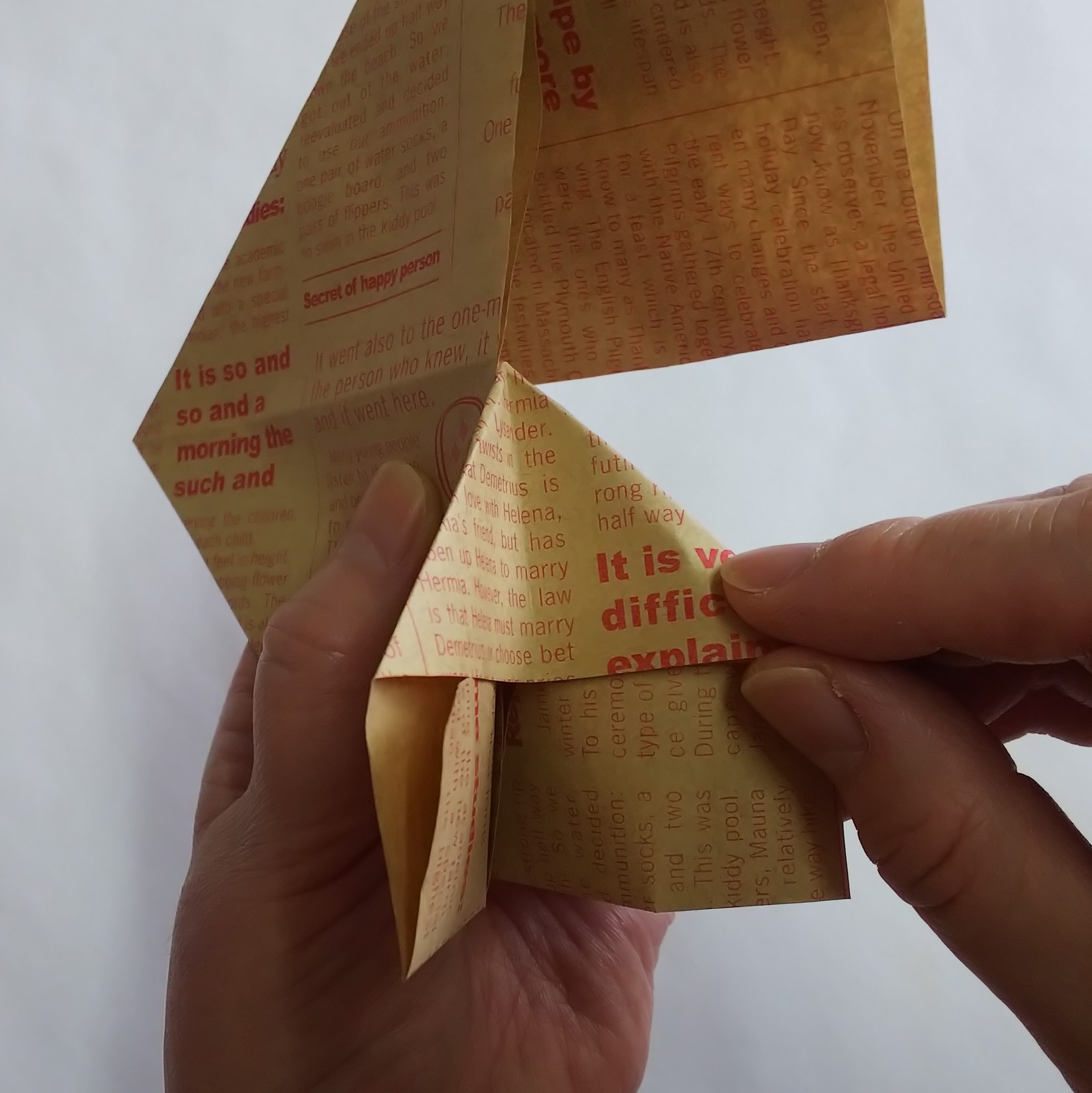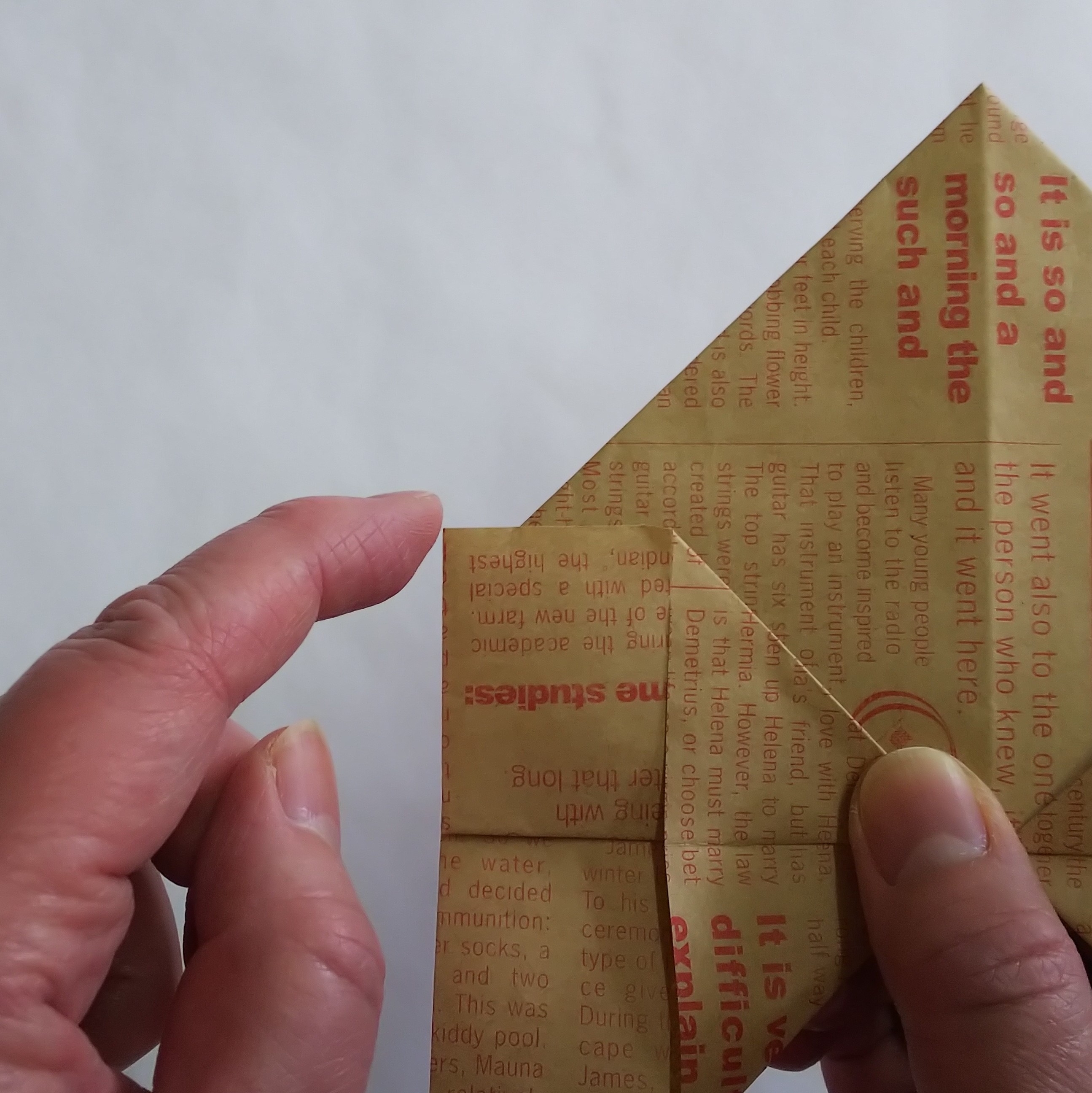 13.で開いて折った三角の端を、いちばん下の紙と、下からにばんめの紙の間に差し込みます。