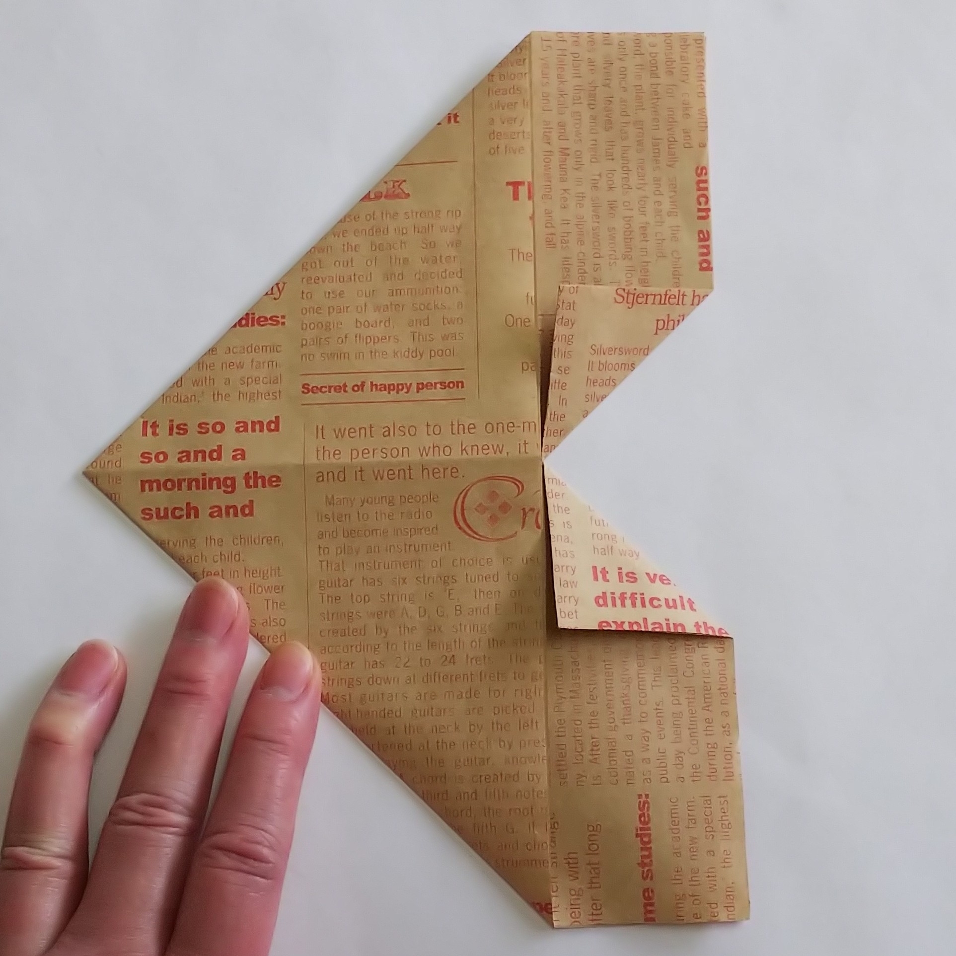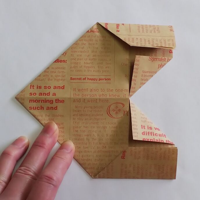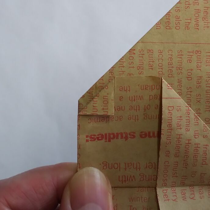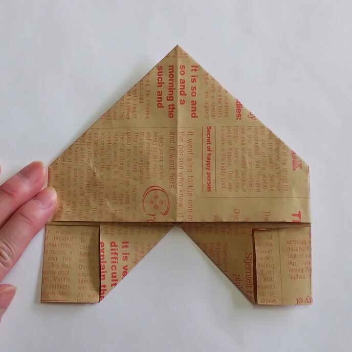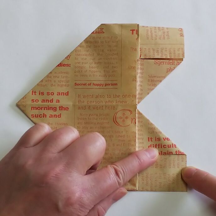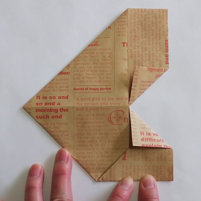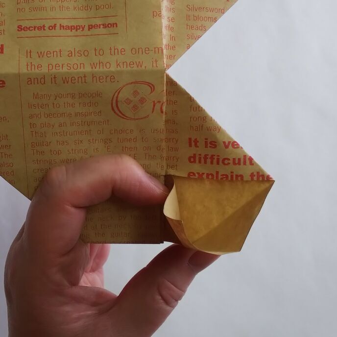 13.で開いて折った三角の端を、いちばん下の紙と、下からにばんめの紙の間に差し込みます。
