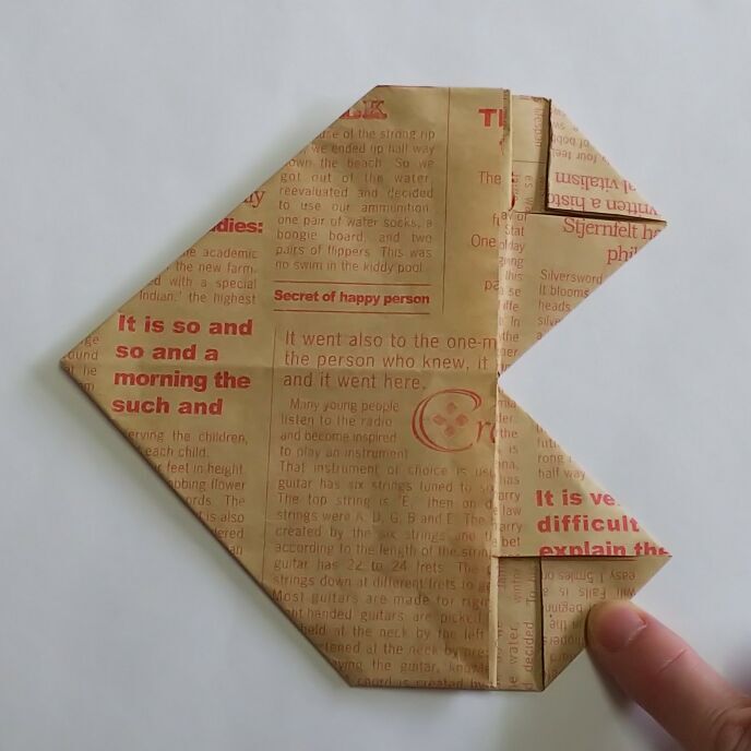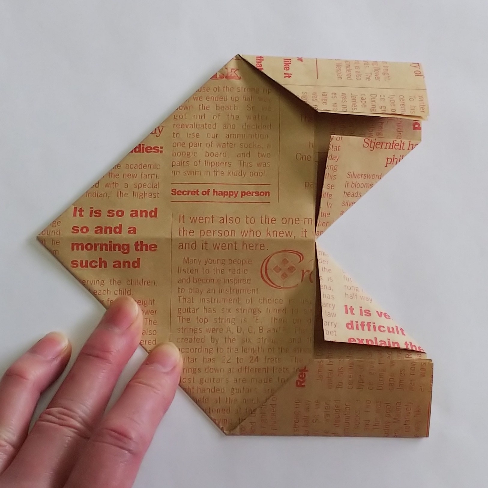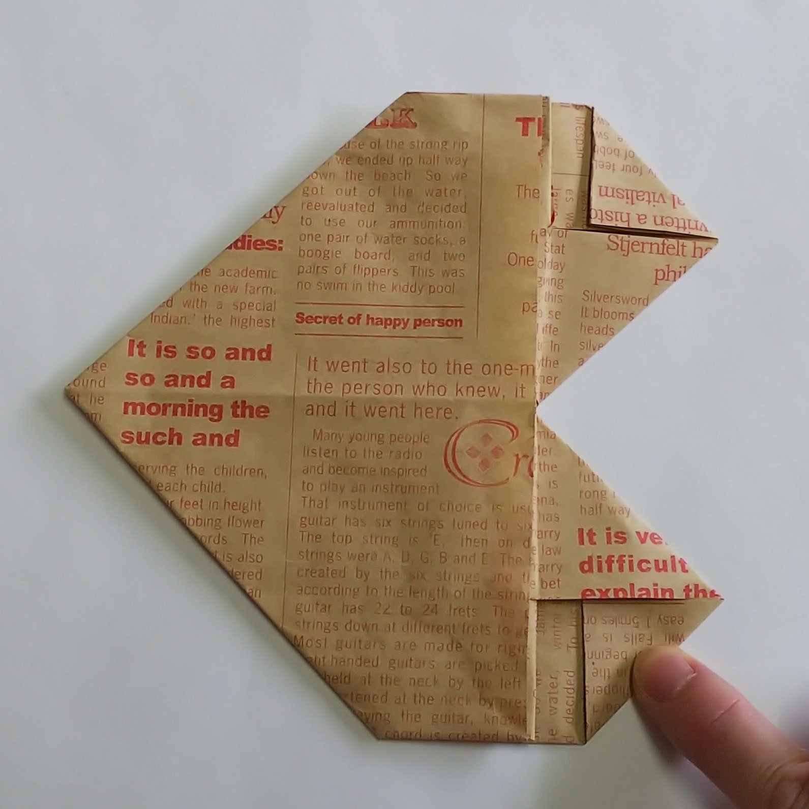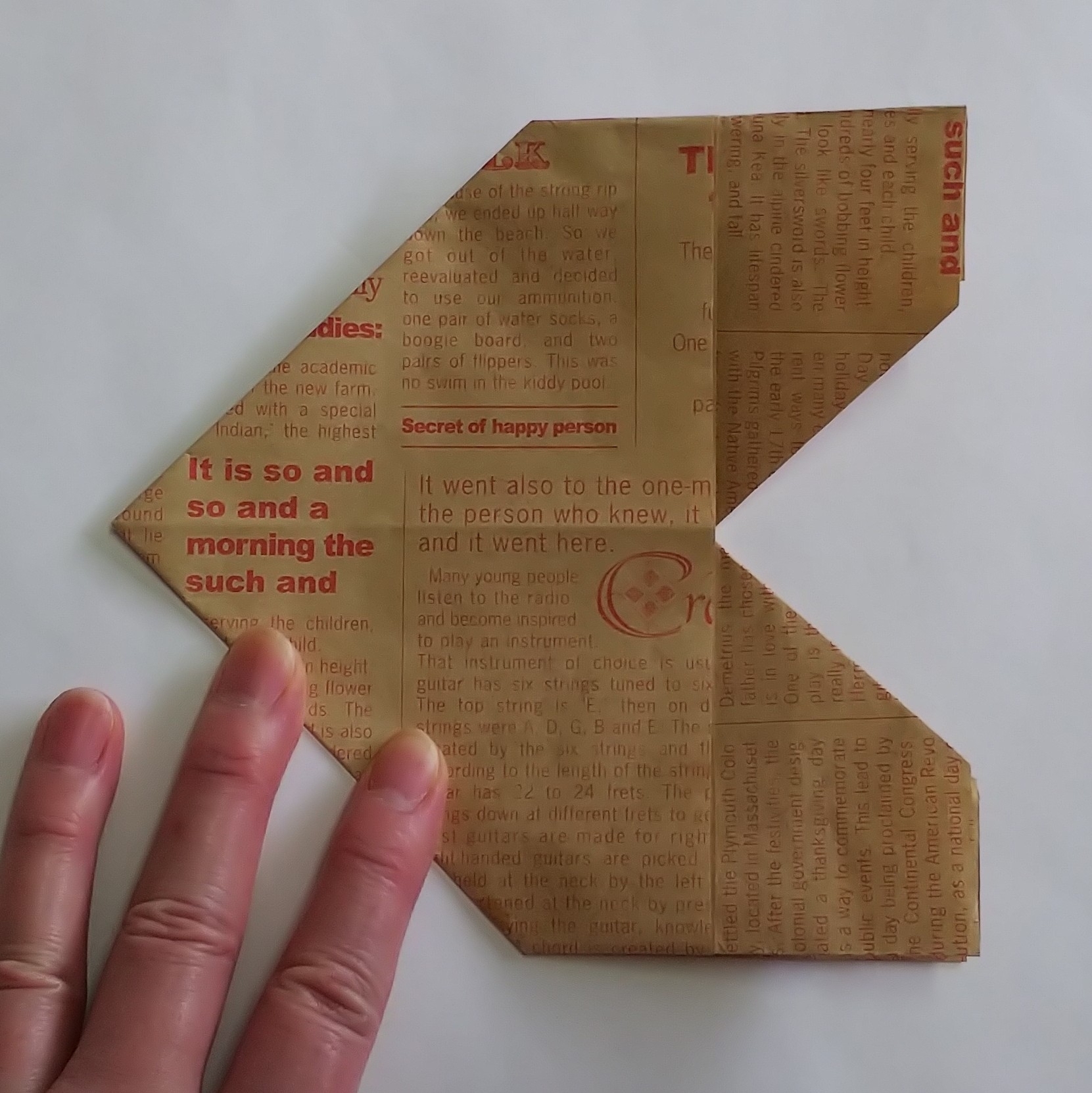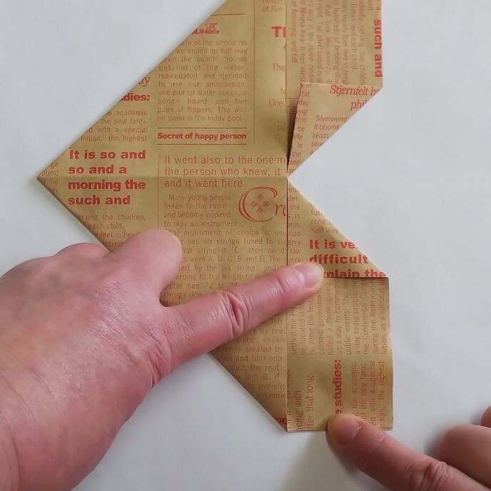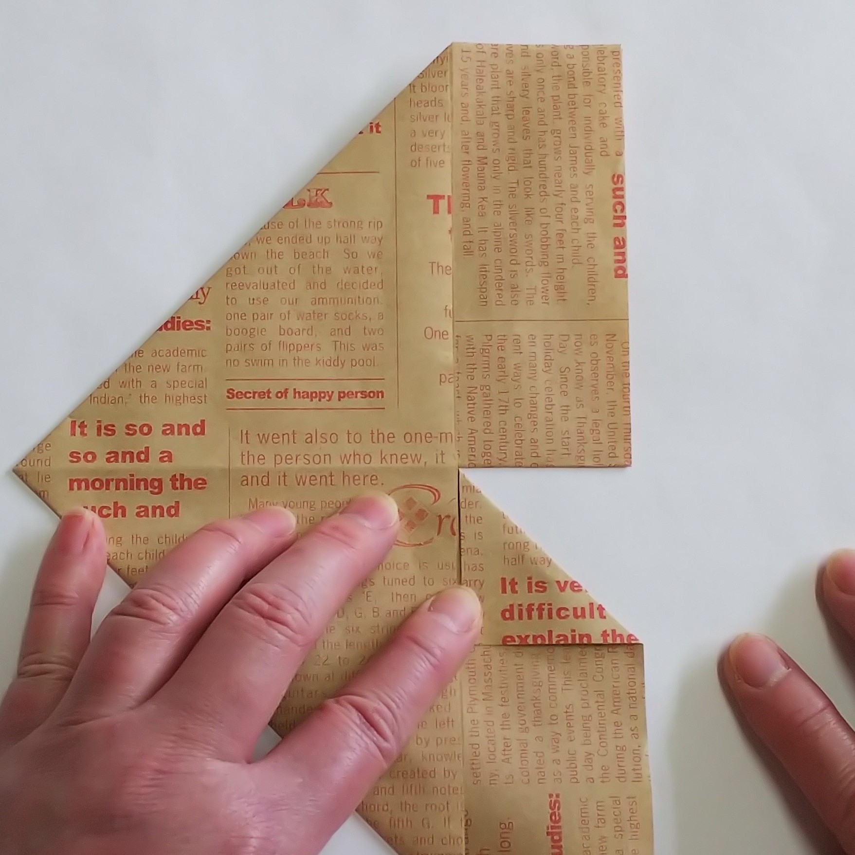 13.で開いて折った三角の端を、いちばん下の紙と、下からにばんめの紙の間に差し込みます。