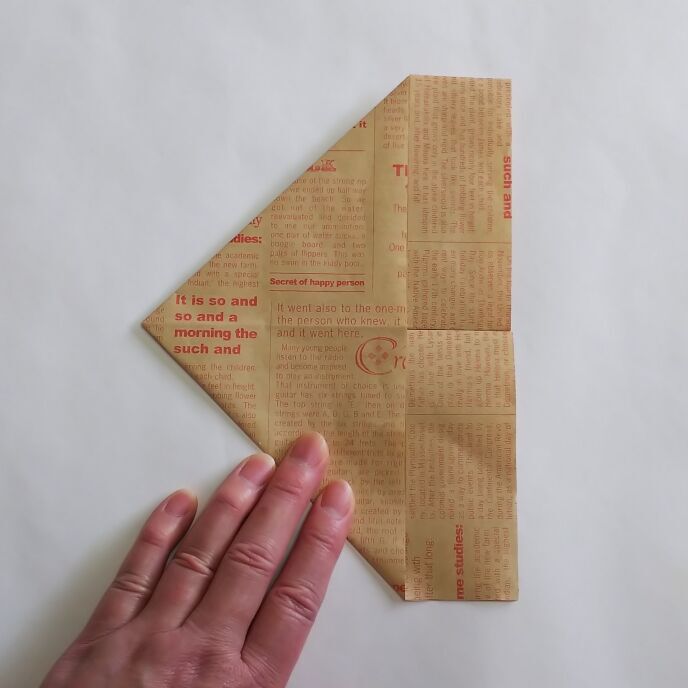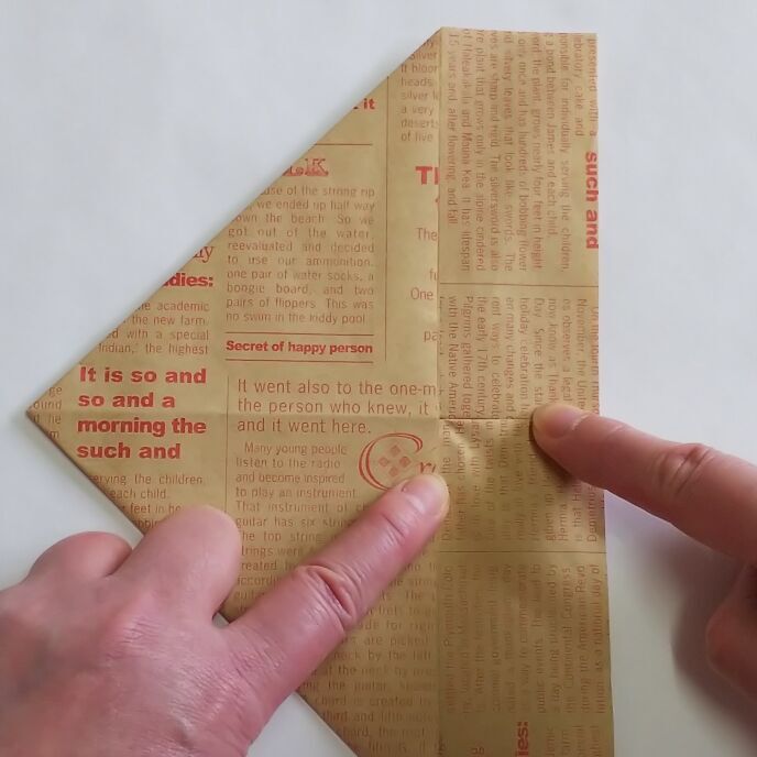 指差している中央横方向の辺が、指差している縦方向の紙の辺と合うように、三角に折ります。