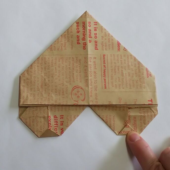 ハートの形の頂点から、左右におりているななめの辺から、写真で指差しているように、先ほど折り上げた紙の角が少しはみ出しているので、ななめの線の内側に、角を少し折ります。