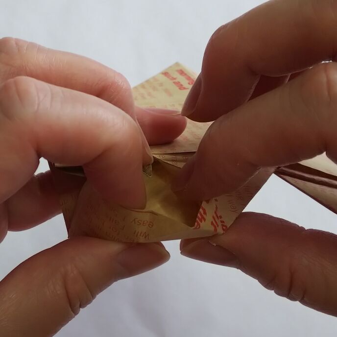 6.で折ったところの折り線をたよりにして、下の写真のように開き、開いた部分を内側に入れ込みます。