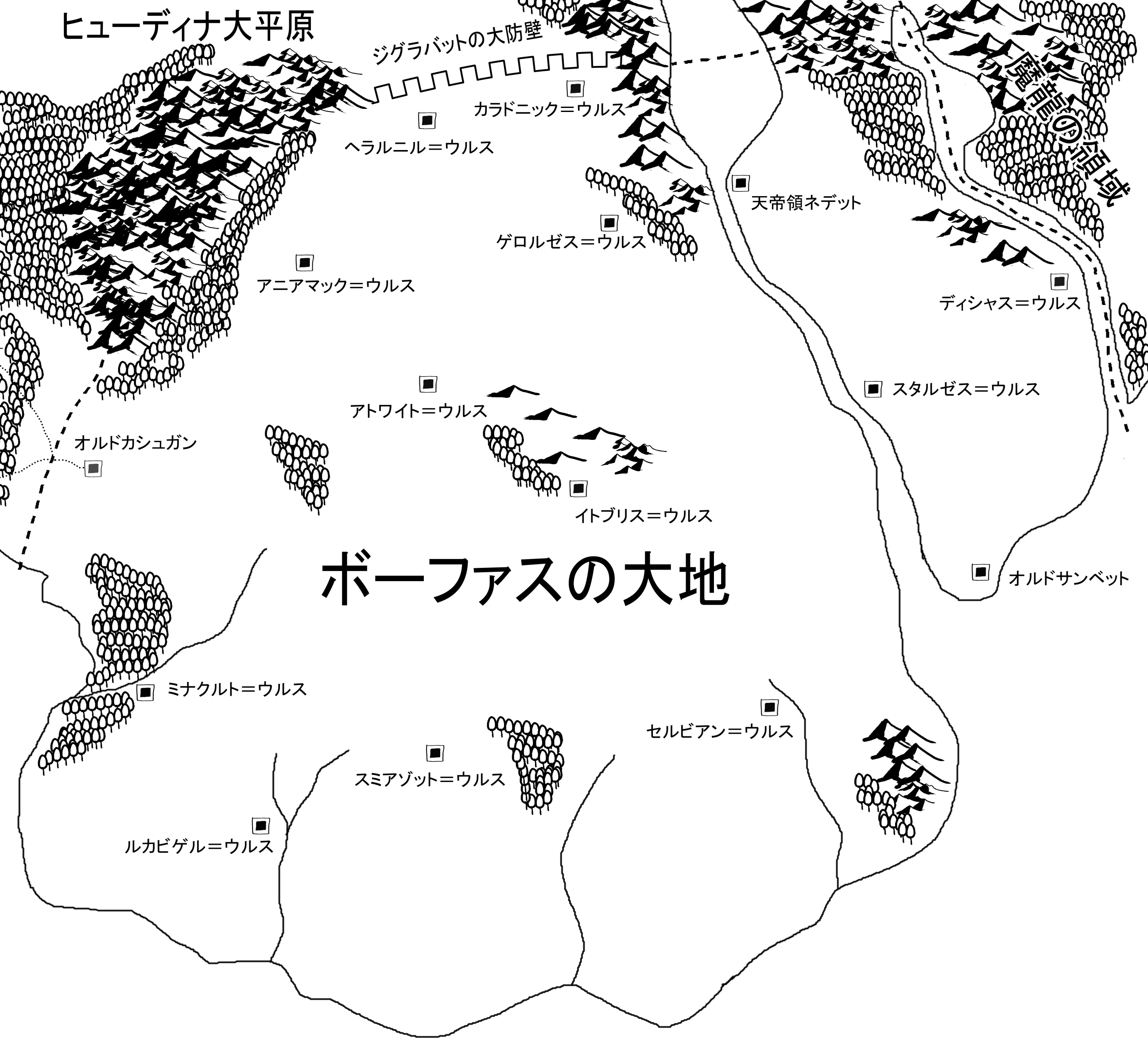 黒の部族の住む大平原地帯です。気候は若干乾燥気味であり、多くの黒の部族が遊牧生活を行っています。遊牧民にとっても定住拠点であるオルドは重要な存在です。特に十二氏族長の住むウルスはボーファス帝国最強の十二狼軍の拠点となっています。