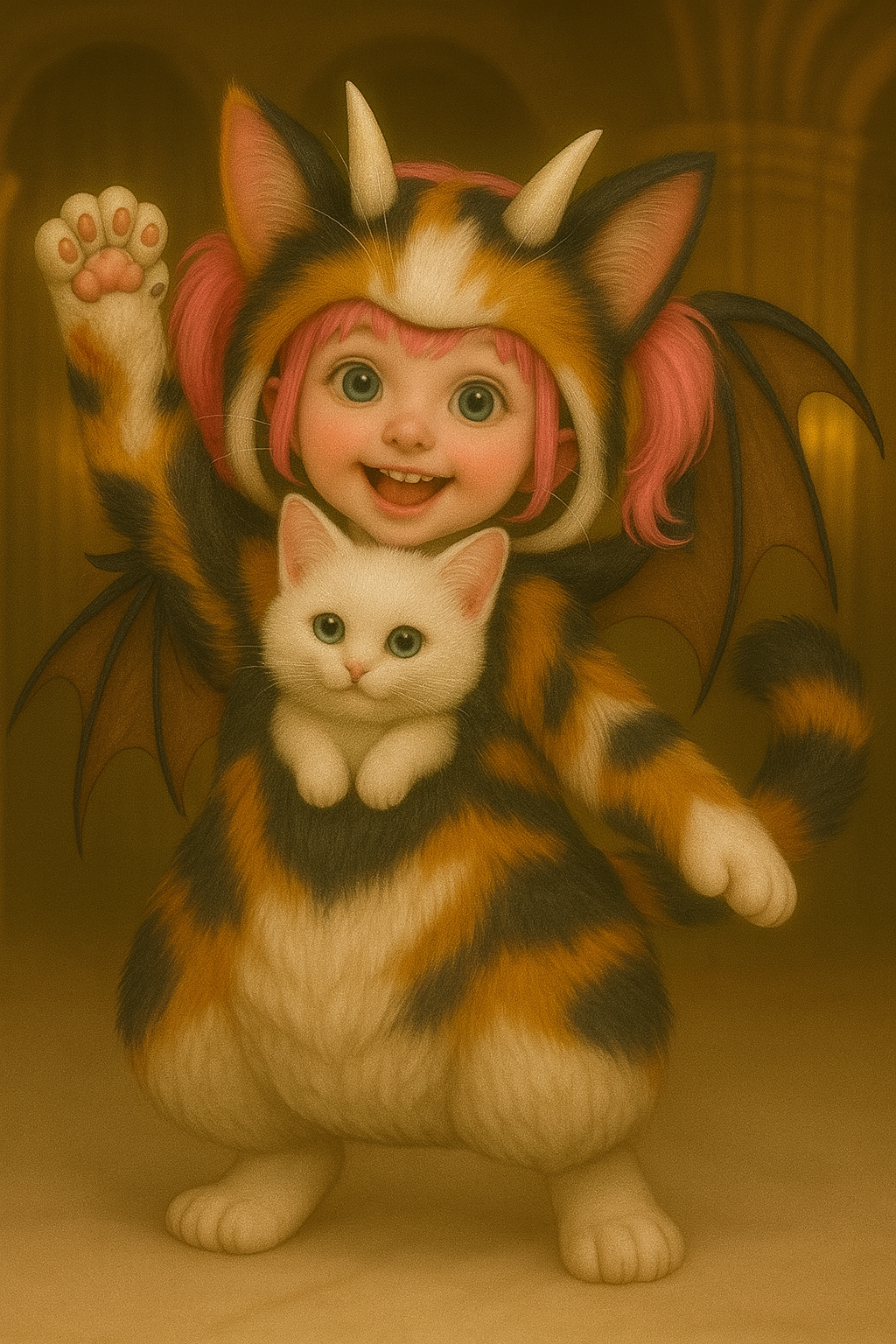 何故か三毛猫の着ぐるみを着たトゥエラが、四足歩行で尻尾をぶっとく膨らませて飛び込んでくる。