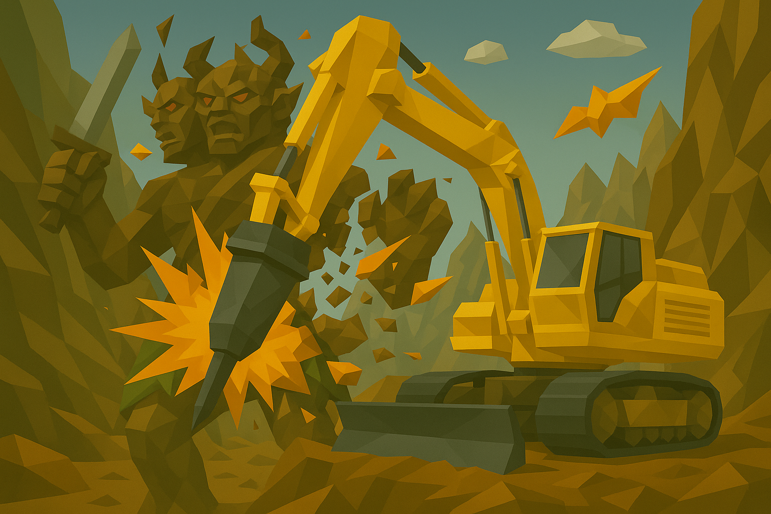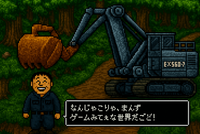 おっさんが攻撃を意識すると、画面半分程もある重機のバケットアームがボコッと伸びて……