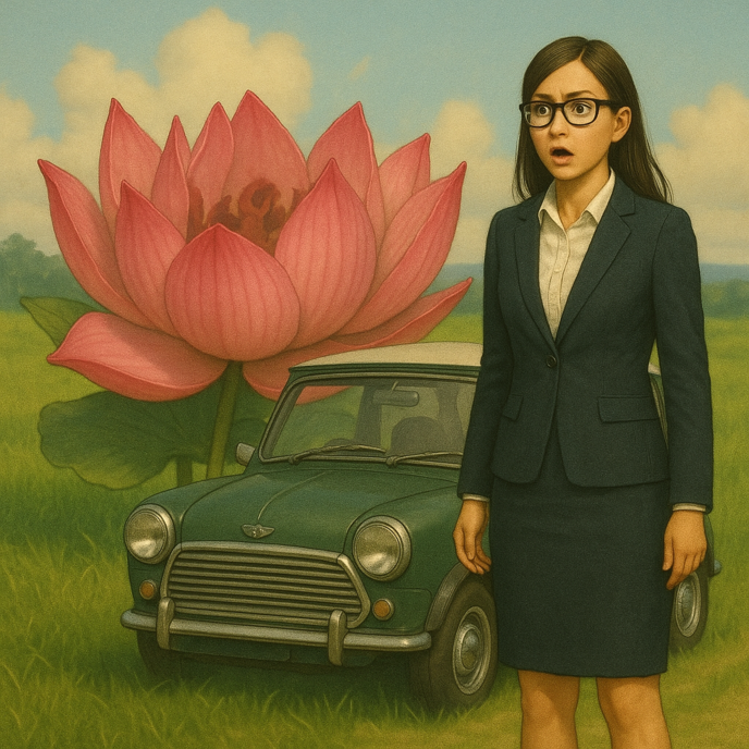 リリが「ちょっと休憩しよっか」と言い、旧型ミニはカーブ脇の草地に静かに停まった。