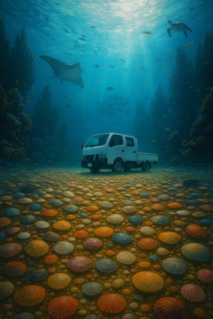 タイヤには水掻きのような結界を施してくれたらしく、まるで無重力の宇宙を進む小型探索艇のように、ハンドルを切ればその通りにすすみ、ゆっくり、ゆっくりと、深海へと降りていくのであった。