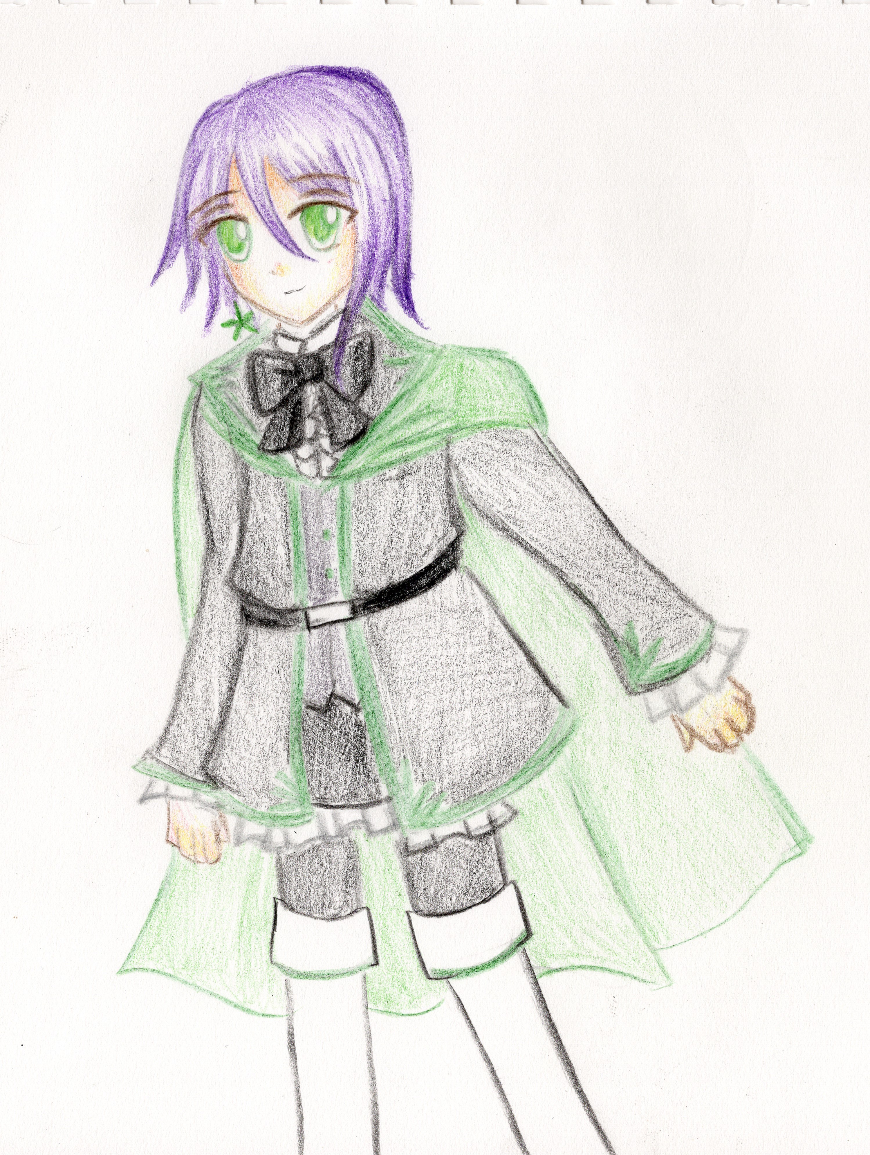 容姿:肩甲骨くらいまで伸びた緑髪に、紅色の瞳。右側の顔は大抵前髪で覆われている。背が高いが、体格は良い方ではない。