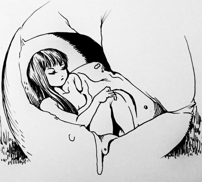 10歳ぐらいの年齢の黒髪の女の子が卵の中の粘液に浸りながら眠っていた。
