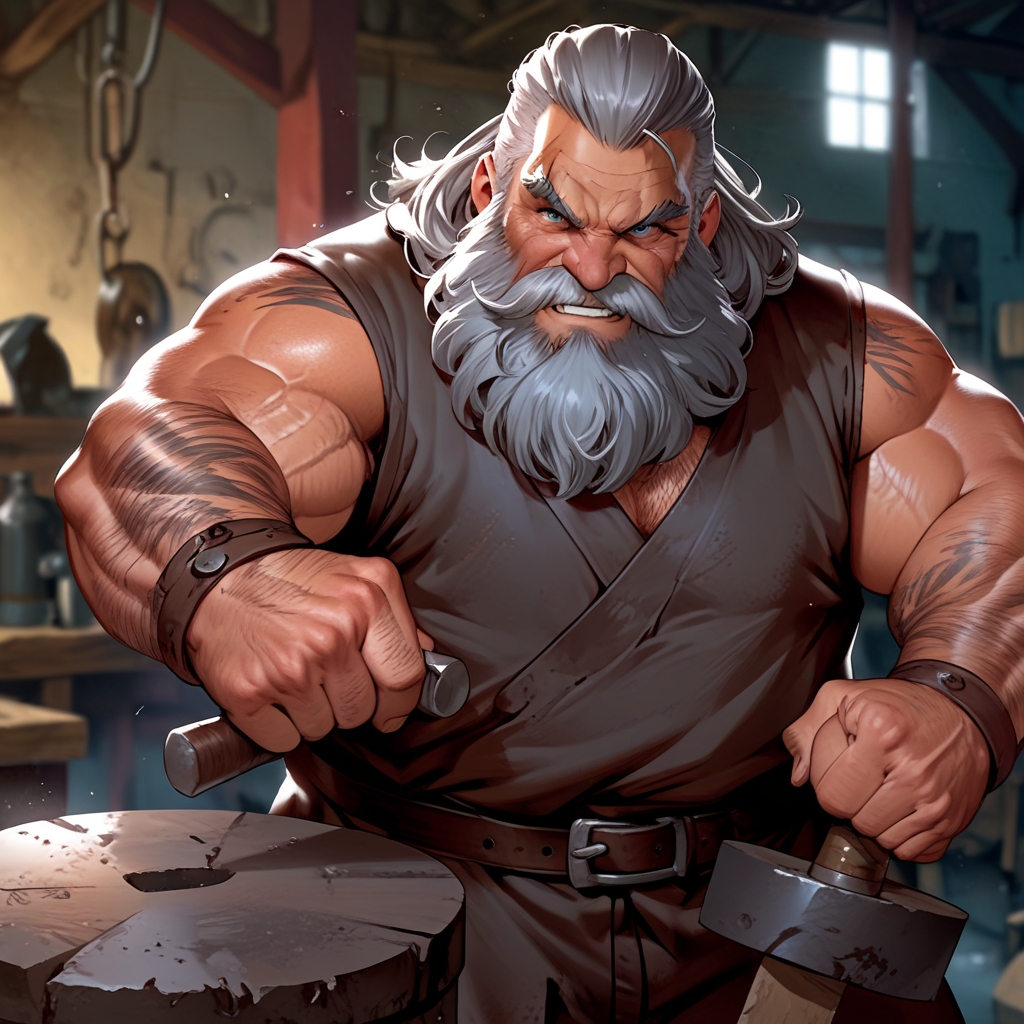 場の空気が一層張り詰める中、ゾーイの表情には孤独な影が浮かんでいた。鍛冶でできた古い火傷の痕が頬や額に残り、彼の手は炎と鉄と向き合ってきた鍛冶師としての長年の労苦を物語っている。その堂々たる姿にも、今はどこか沈んだ暗さが見えた。