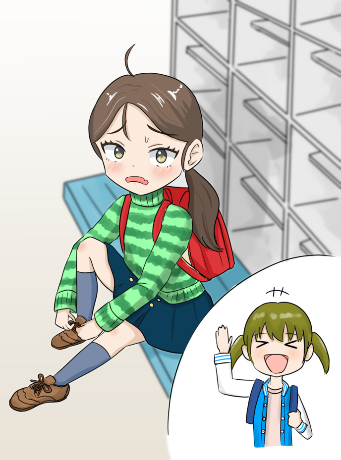 そのままツバキちゃんはランドセルを背負い、昇降口まで小走りでかけ、靴箱の前に着くと、急いで上ばきをぬいで外靴にはきかえます。