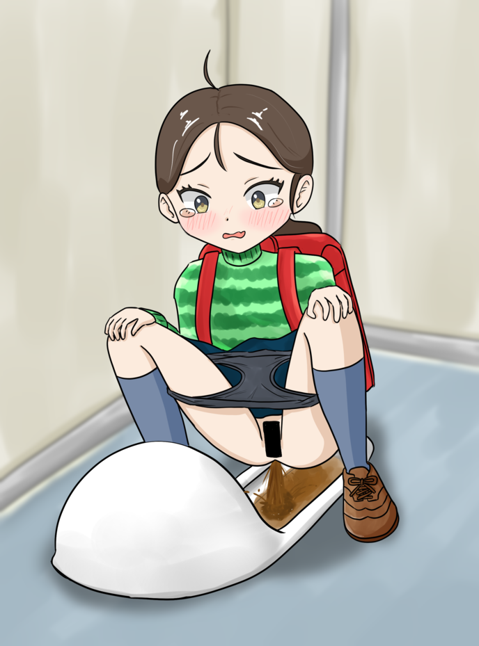 スカートをまくり上げ、黒地のレース付きのパンツをあわてて下ろすツバキちゃん。背中のランドセルの重みのおかげもあって、勢いよく便器の上にしゃがみこみました。ゆかのタイルが目に入った、次の瞬間――。