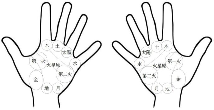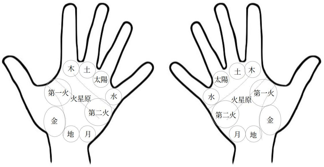 ※地丘は、近代に後付けされた手相の丘であり、伝統的な手相の丘ではないです。