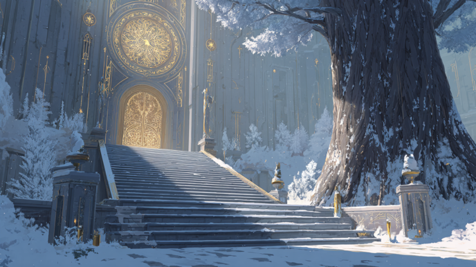 樹の側面に寄り添うように建つ神殿の大扉には、金色の魔法陣が円環を描いて静かに浮かび上がっている。