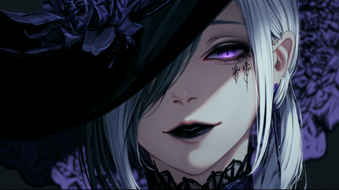 片目は髪に隠れ、紫の瞳が妖しく覗いていた。目尻には、奇妙な細い刻印。
