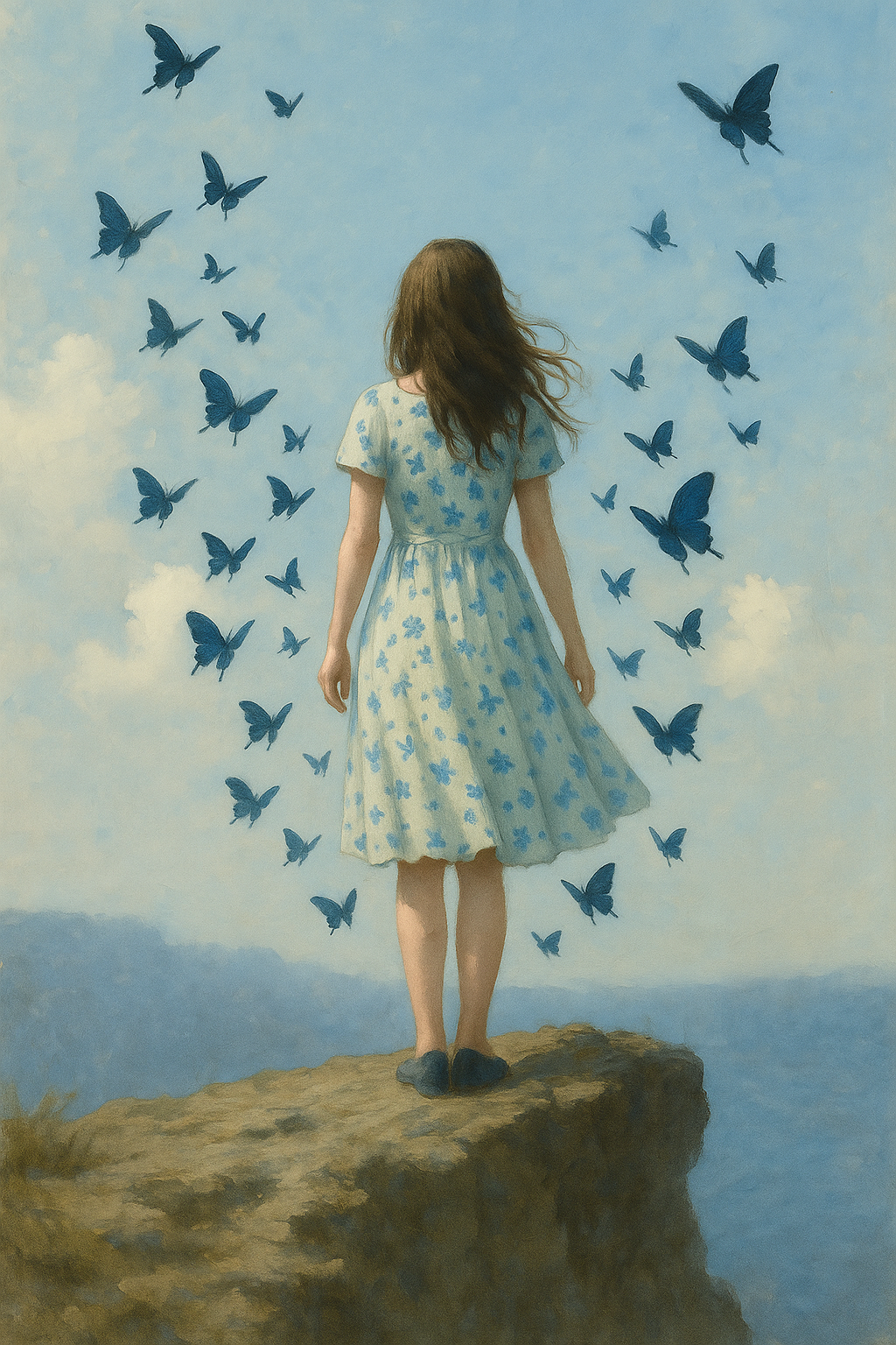 チョウが舞うその花畑で、ジェシカが手を振っていた。 水色のワンピースに、金色の巻毛、ヒラヒラした水色の帽子をかぶって花畑の真ん中にいた。