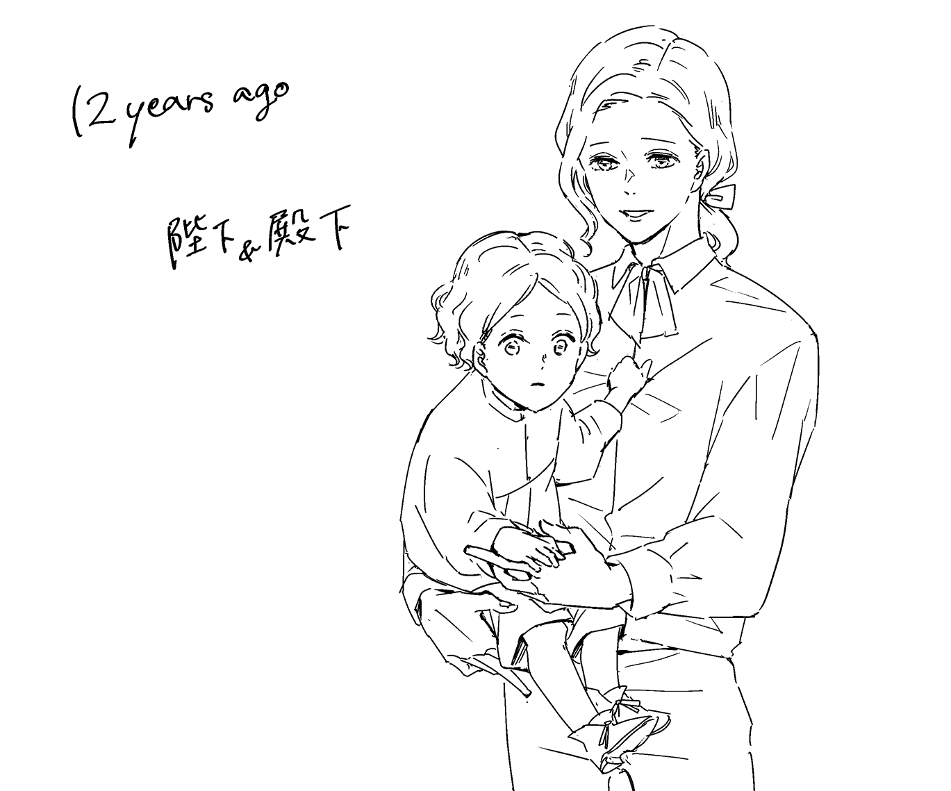感謝を込めて、リクエスト頂いていた、「学生時代の陛下がちび殿下を抱っこしている」イラストです。