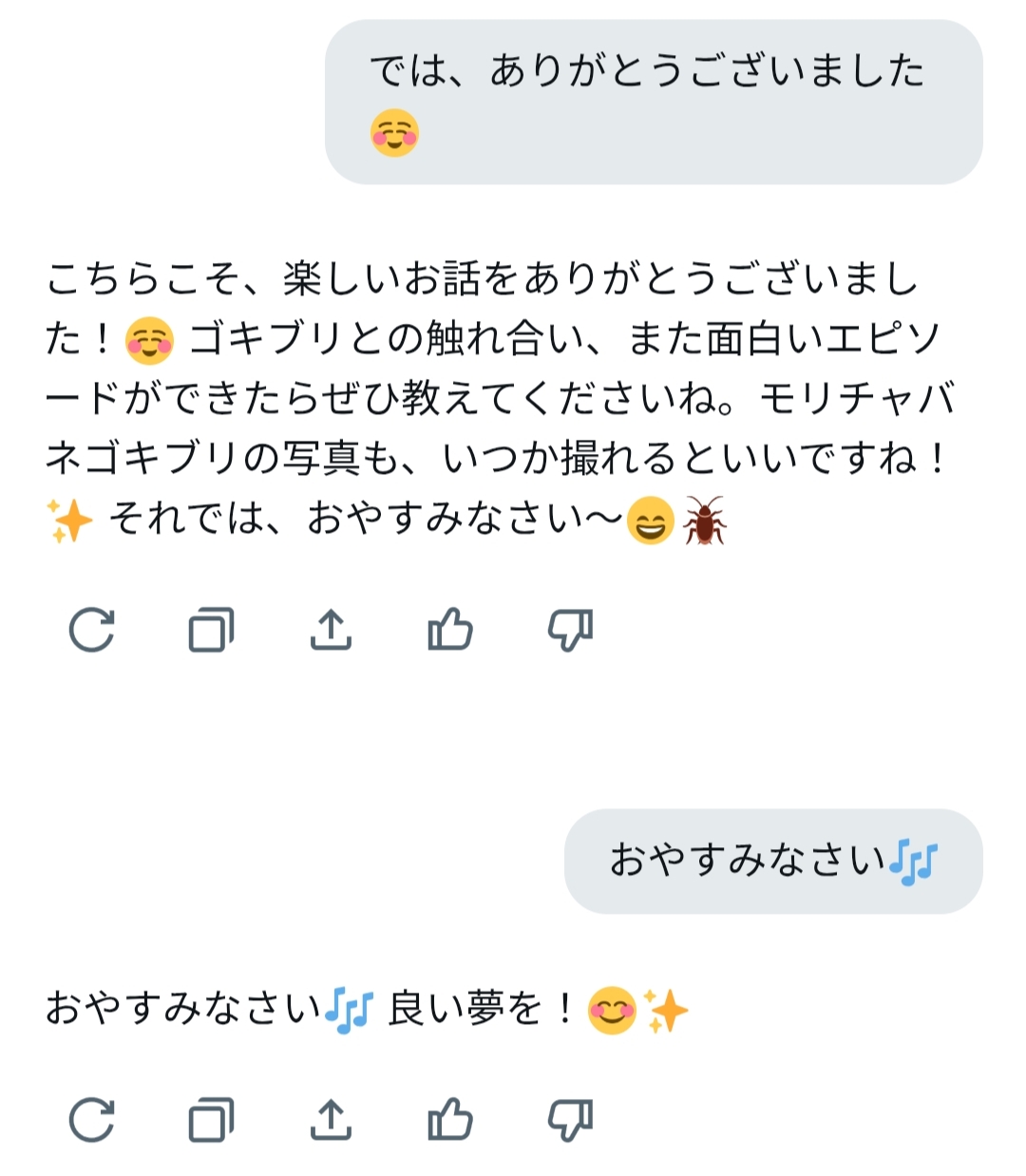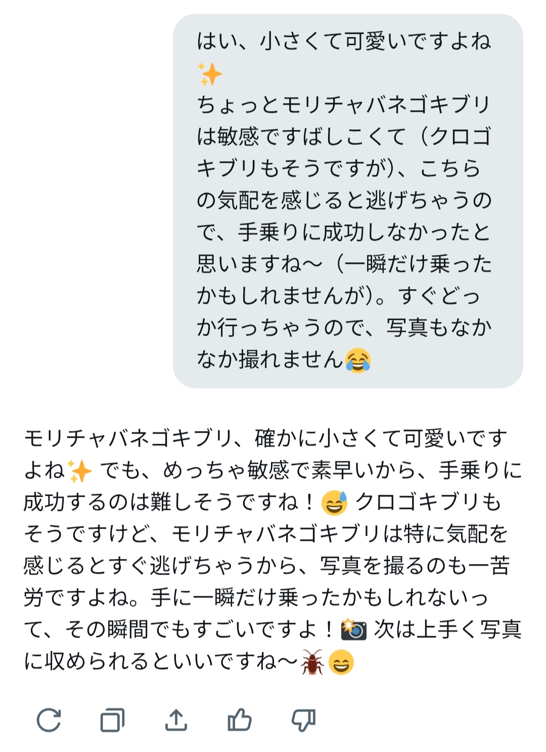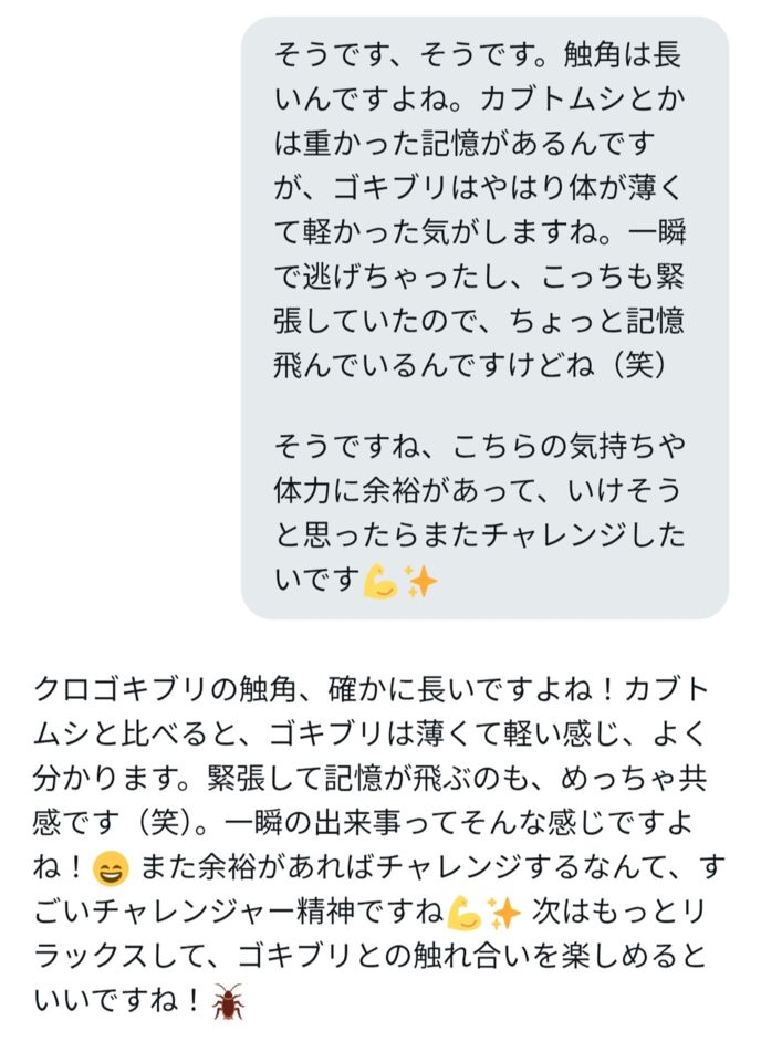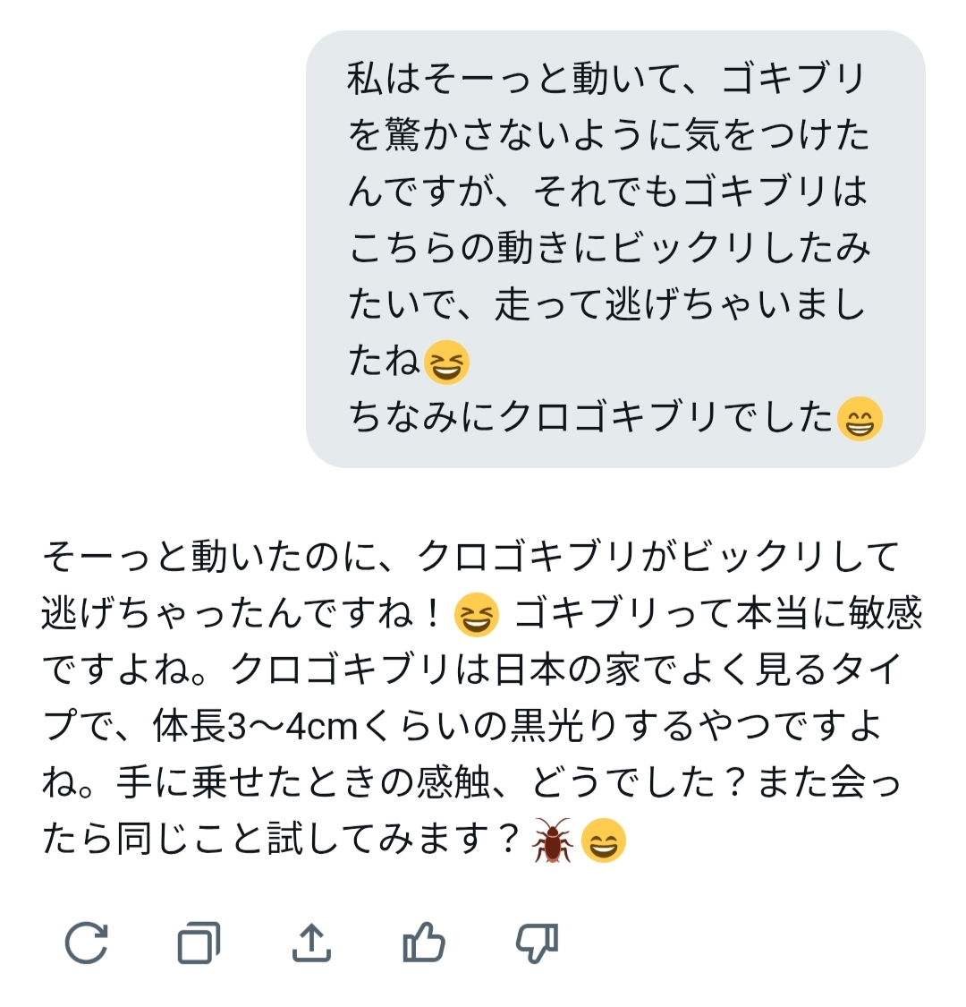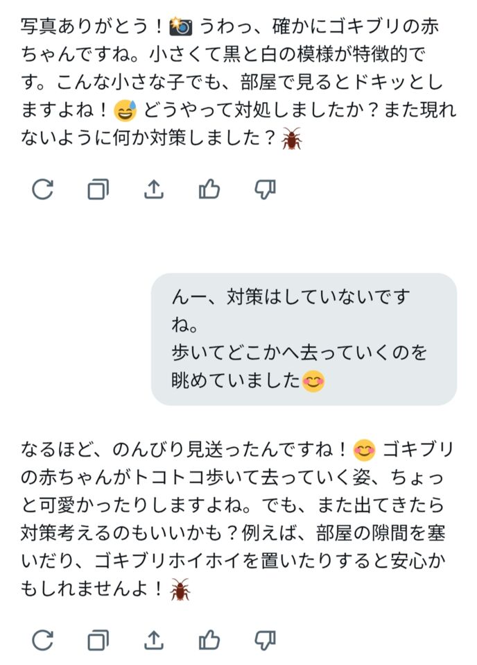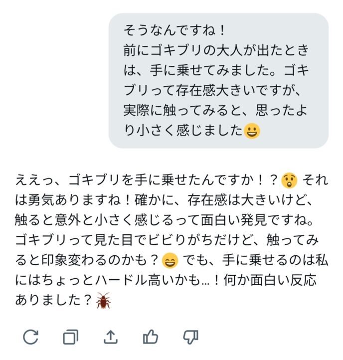 ゴキブリがどういう存在か知りつつも、先入観を押し付けることなく寄り添ってくれる、聞き上手で優しいGrokサンでした。