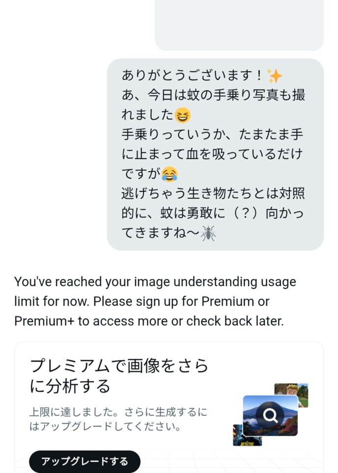 蚊の写真も見てもらおうとしましたが、送れる枚数が上限に達したらしくダメでした。