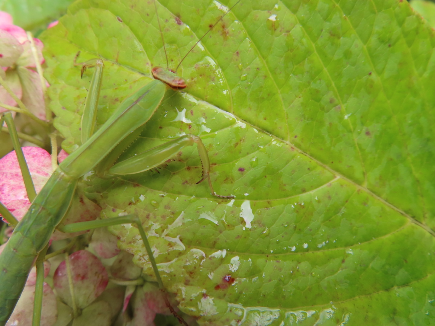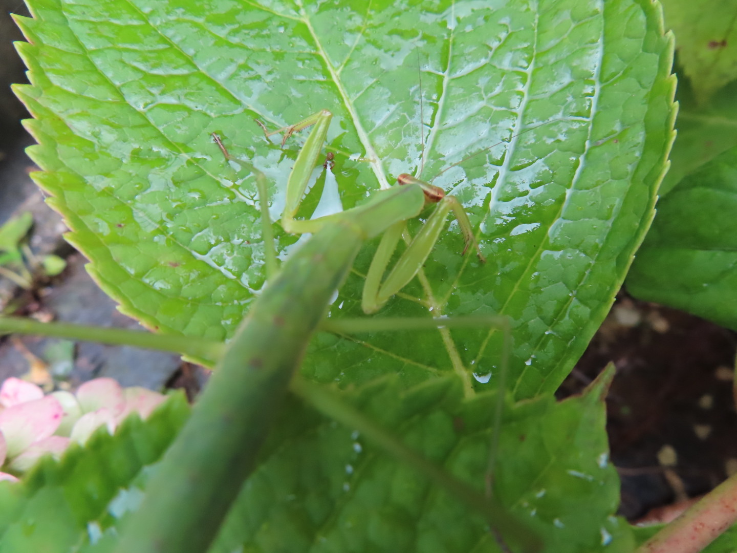 カマキリが、アジサイの葉に溜まった水に口をつけて飲んだのだ。