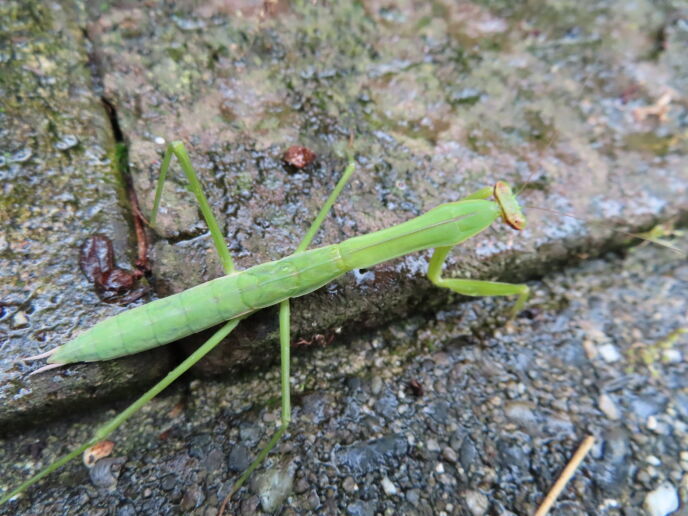 カマキリって水に口をつけて飲むのか! 雨の日のカマキリ幼虫