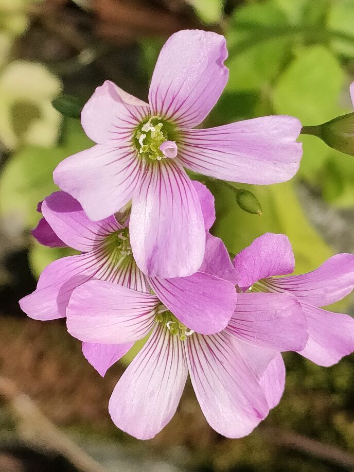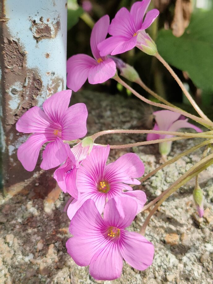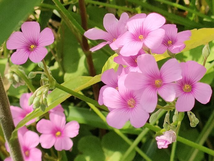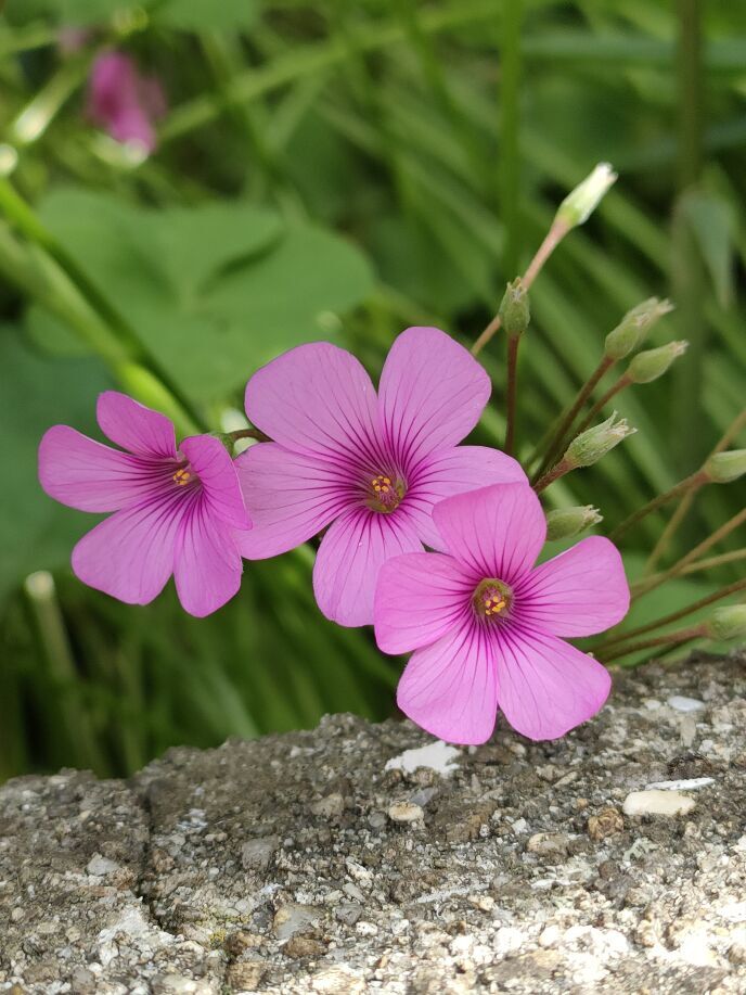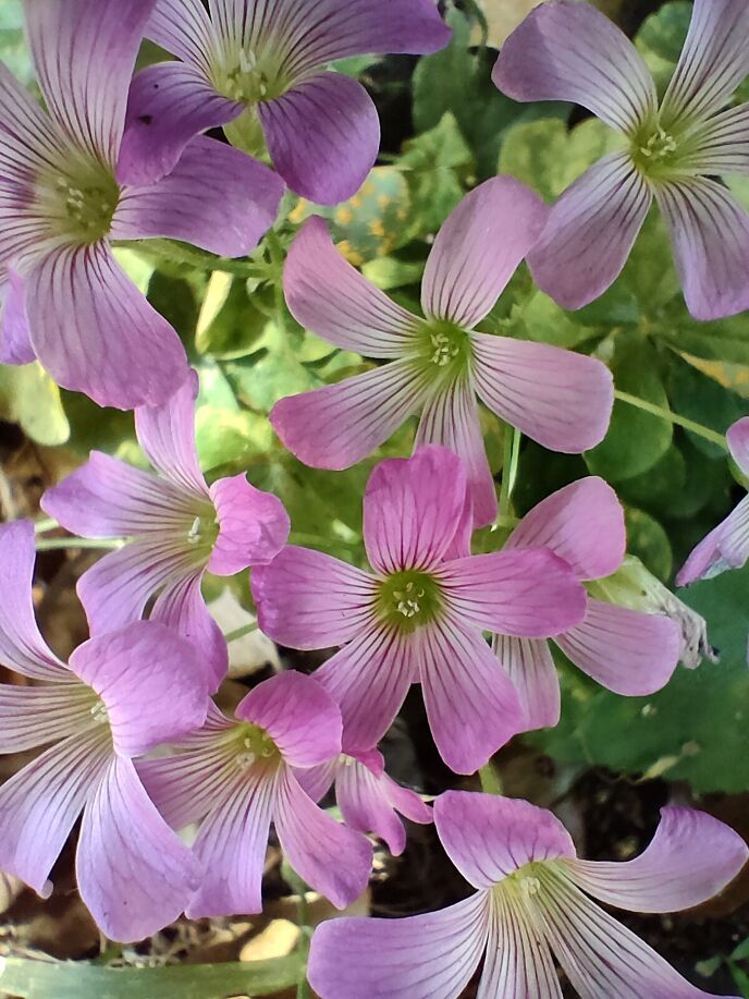 花の中心が濃い赤なのがイモカタバミだそう。花の中心が緑っぽいのがムラサキカタバミ。雄しべが白いのがムラサキカタバミ、黄色いのがイモカタバミ。