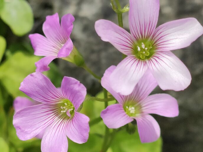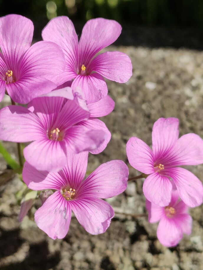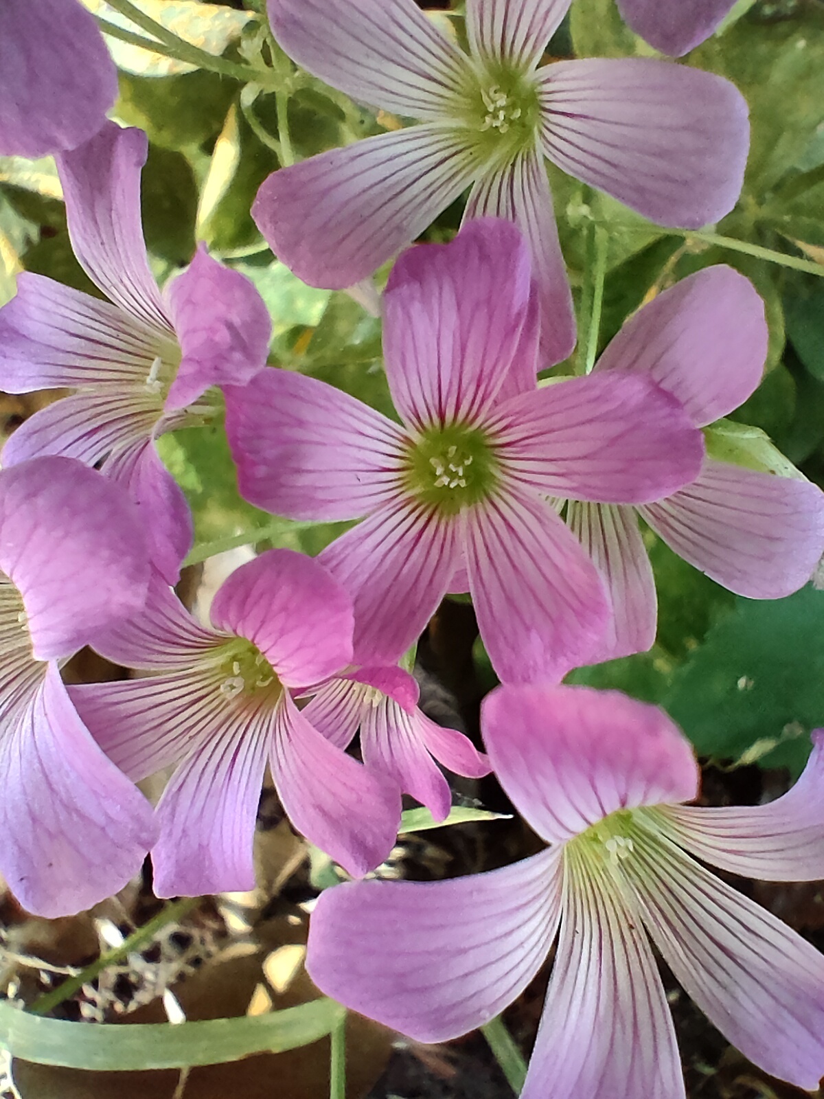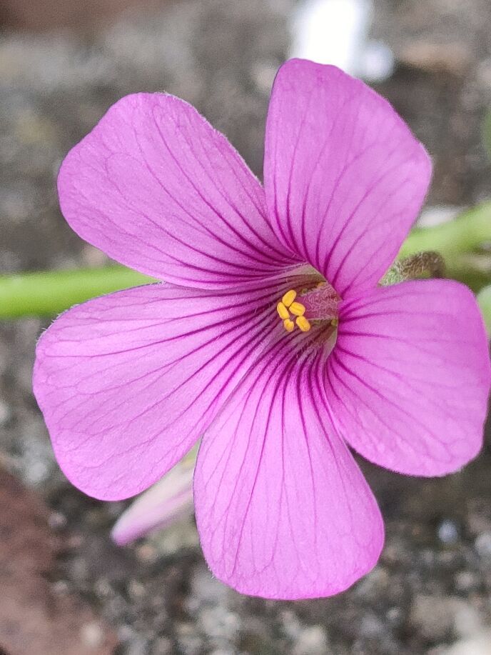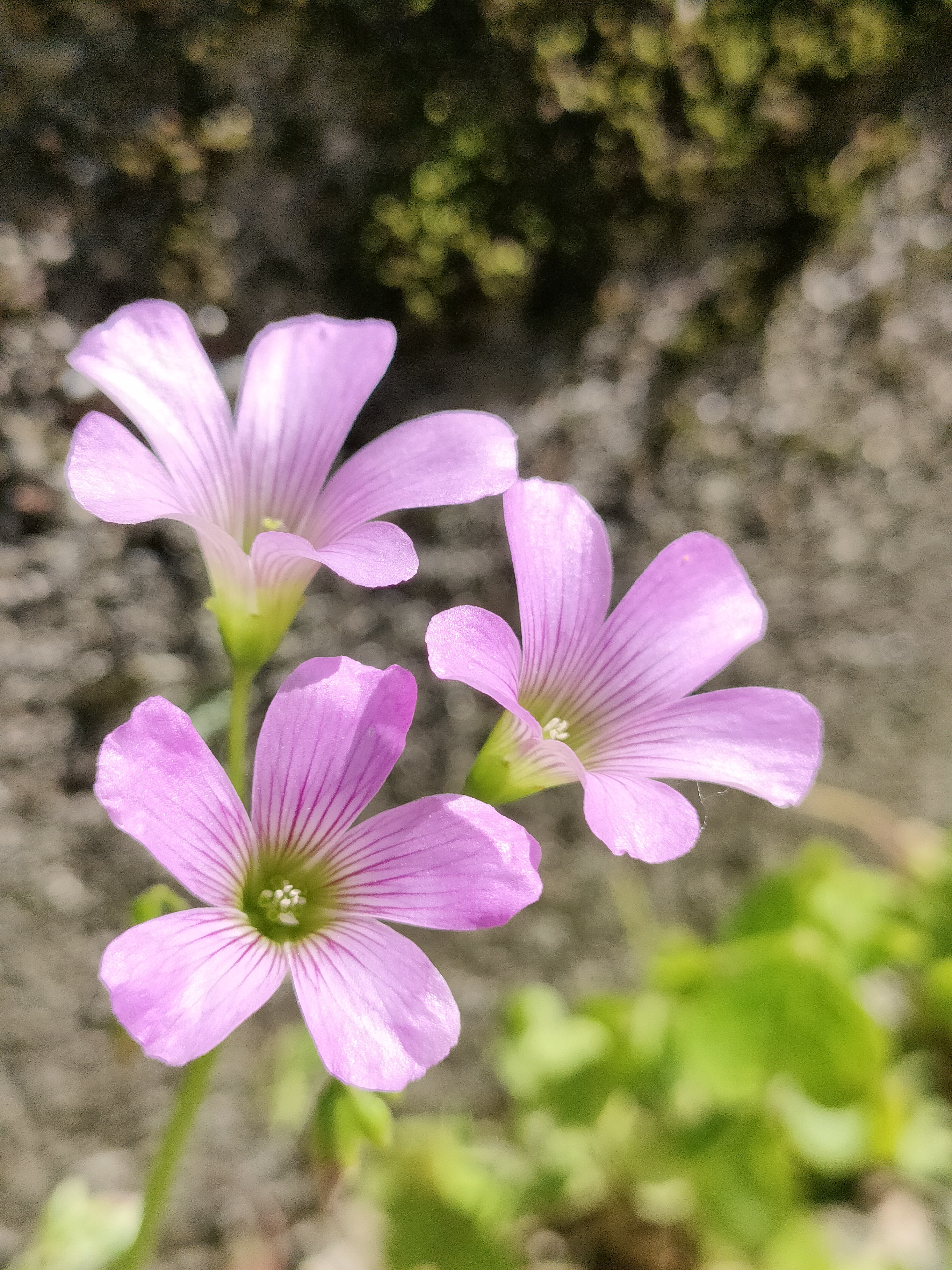 花の中心が濃い赤なのがイモカタバミだそう。花の中心が緑っぽいのがムラサキカタバミ。雄しべが白いのがムラサキカタバミ、黄色いのがイモカタバミ。