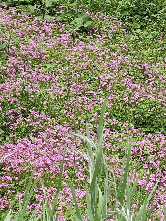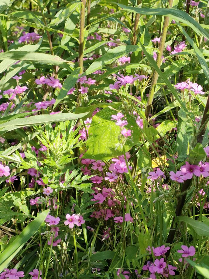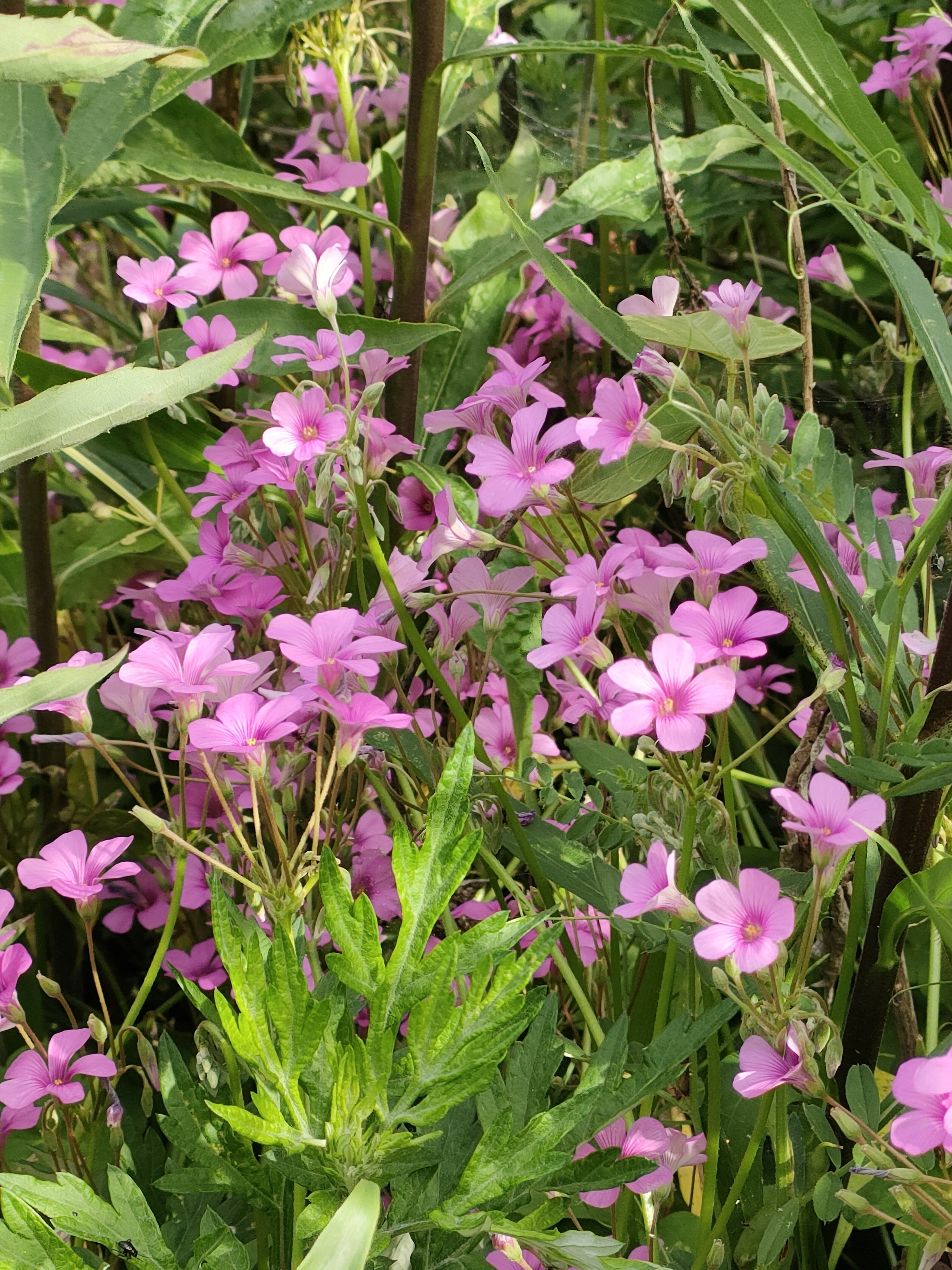 イモカタバミは群生しやすいようです。うちのまわりはムラサキカタバミが多いですが、一面ピンクのところはイモカタバミだと思います。