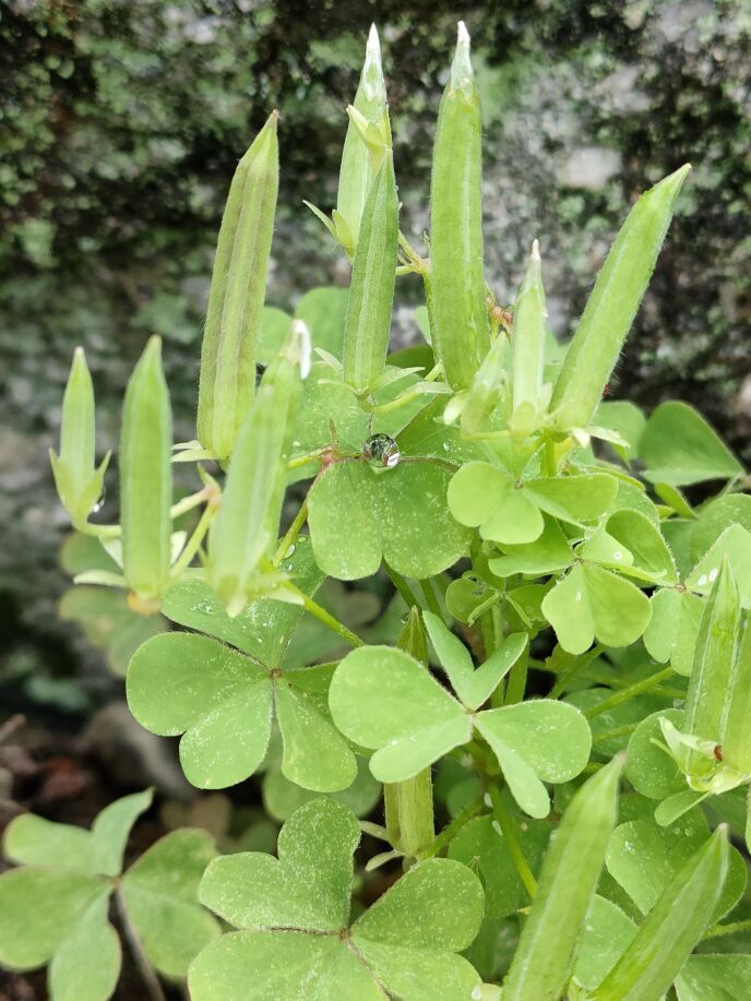 こちら、カタバミの仲間の実。ムラサキカタバミをよく見かけるのでムラサキカタバミでしょうか……でも葉が小さそう。Googleレンズで検索すると「オッタチカタバミ」と出ました。