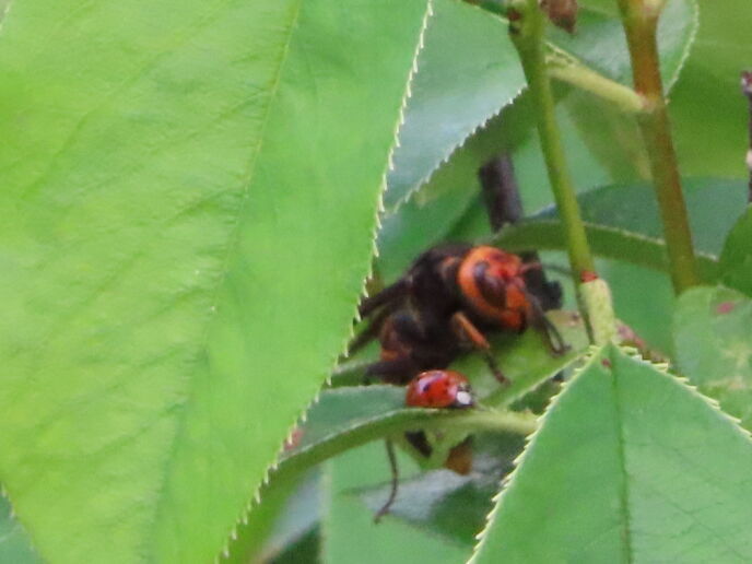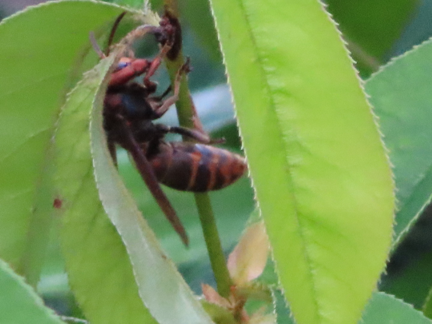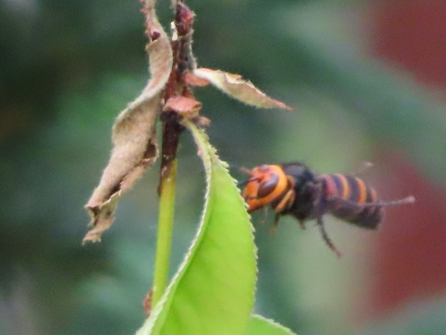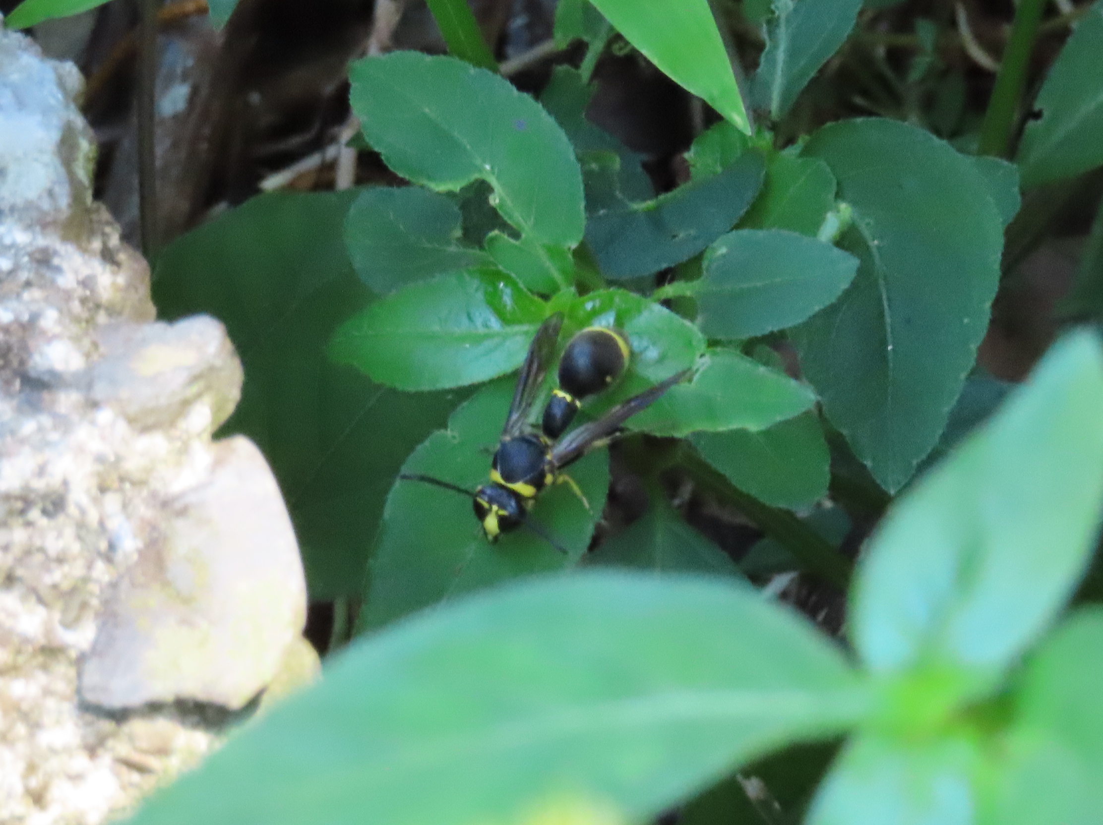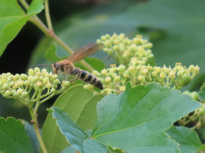 ↓ご近所スズメバチ。他の虫と一緒にいる様子や飛び方が可愛い。ご近所スズメバチはどうも一種類ではないらしい。