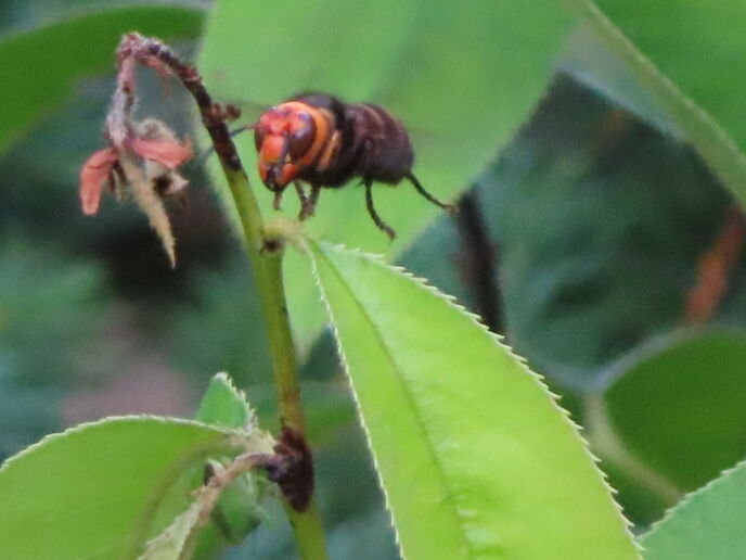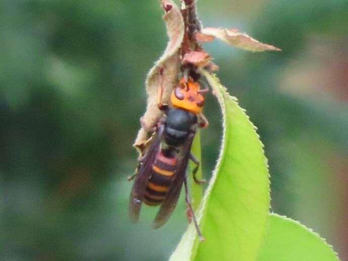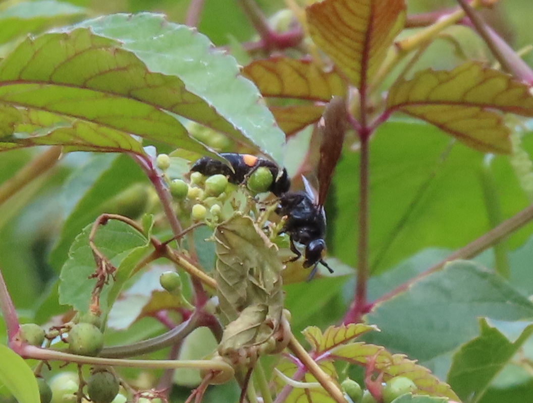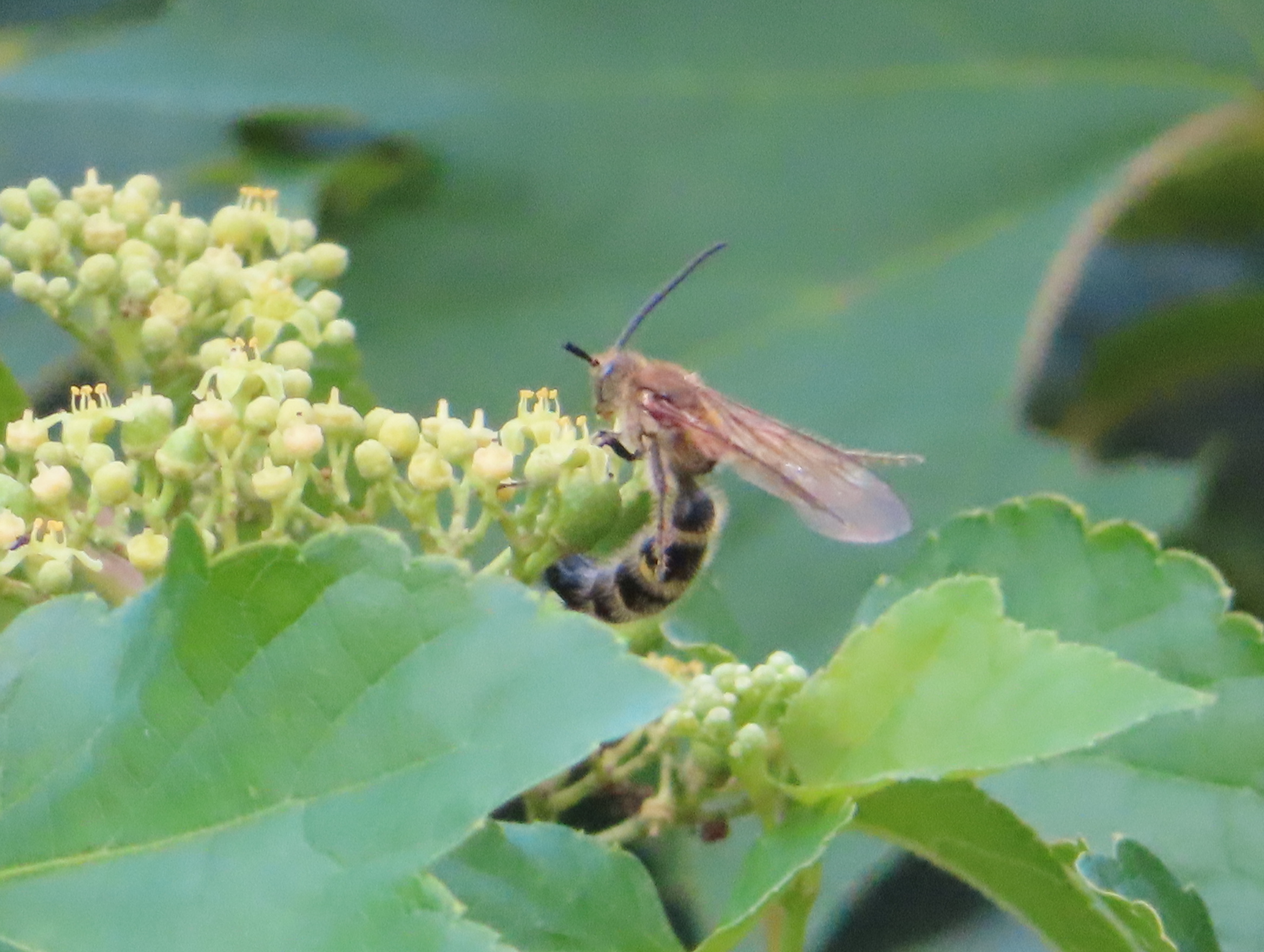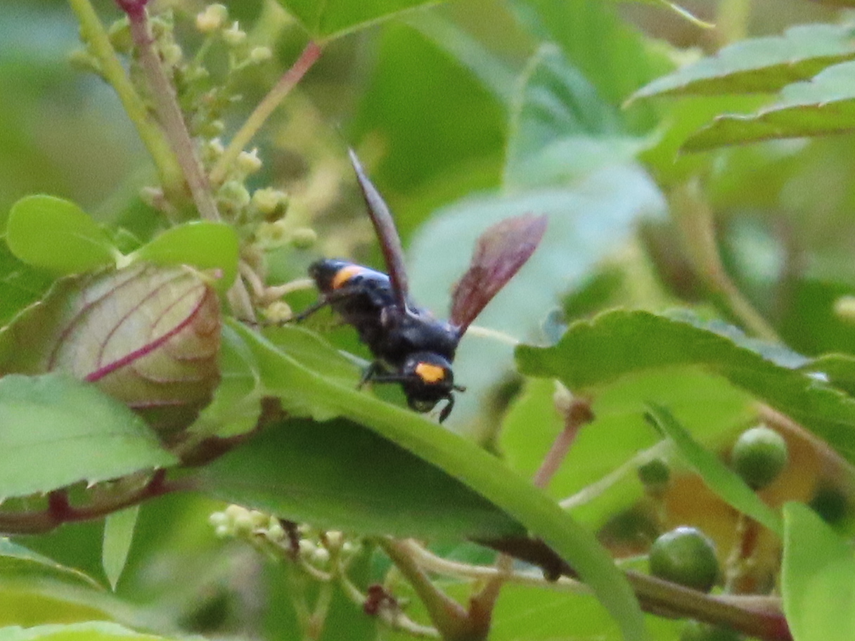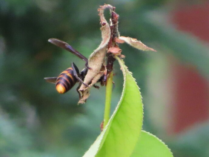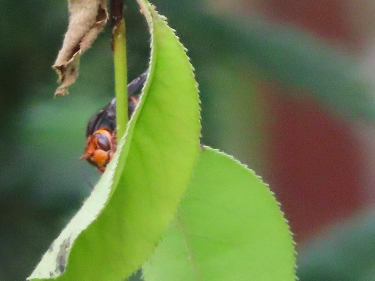 ↓ご近所スズメバチ。他の虫と一緒にいる様子や飛び方が可愛い。ご近所スズメバチはどうも一種類ではないらしい。