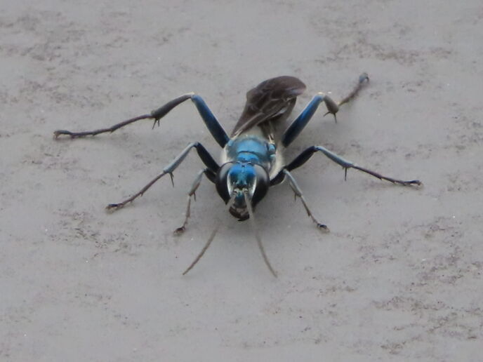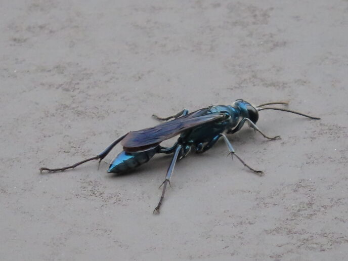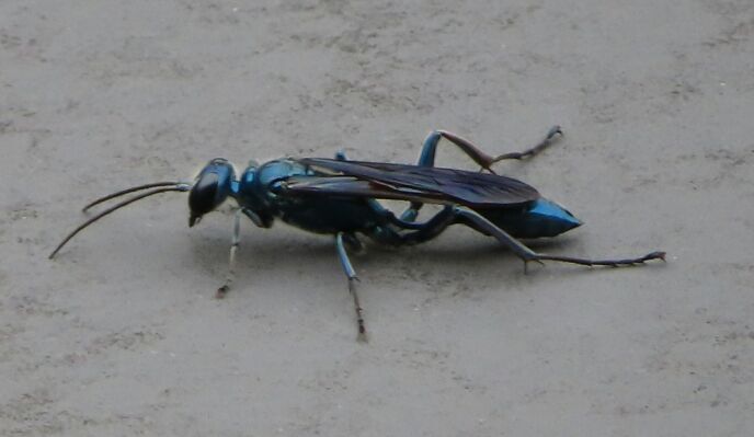 ↓この子は初夏の昼に家に入ってくるルリジガバチ。メタリックブルー。