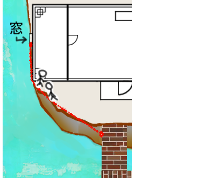 (※赤線が綱渡りする綱です)