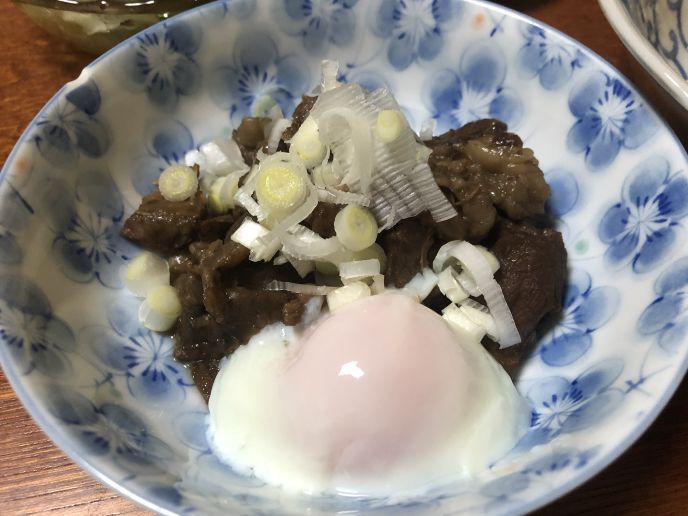 コンニャクや大根と一緒に煮てもいいが、ビクターは牛筋だけで煮て最後に温泉卵トッピングが正義だと思っている。