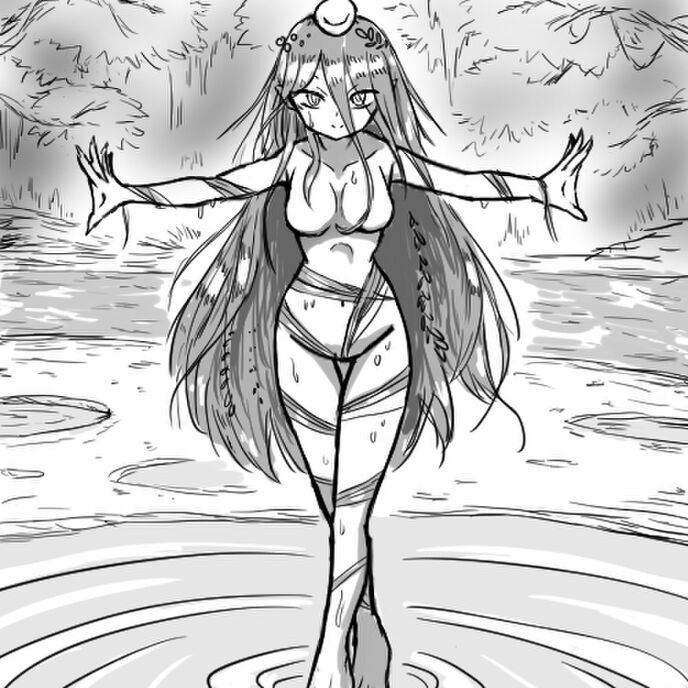 俺はフランをなだめると、改めて女の姿をみた。え?うひゃ、なんだこいつ、素っ裸じゃないか。女は服を一切身に着けず、冷え冷えとした真っ白な肌をさらしている。けど、なんだか違和感のある白さだ……この女、全身白一色だぞ?唇も、つんと張った胸の先端も、指の爪先も……本来なら色の濃淡があるところが、ペンキをぶちまけたみたいに真っ白だ。唯一色があるのは、髪。まるで水草のような碧色の髪は、腰くらいまでの長さで、女の白い肌に絡みついていた。そして頭には、なぜか楕円形の皿のようなものを乗っけている。