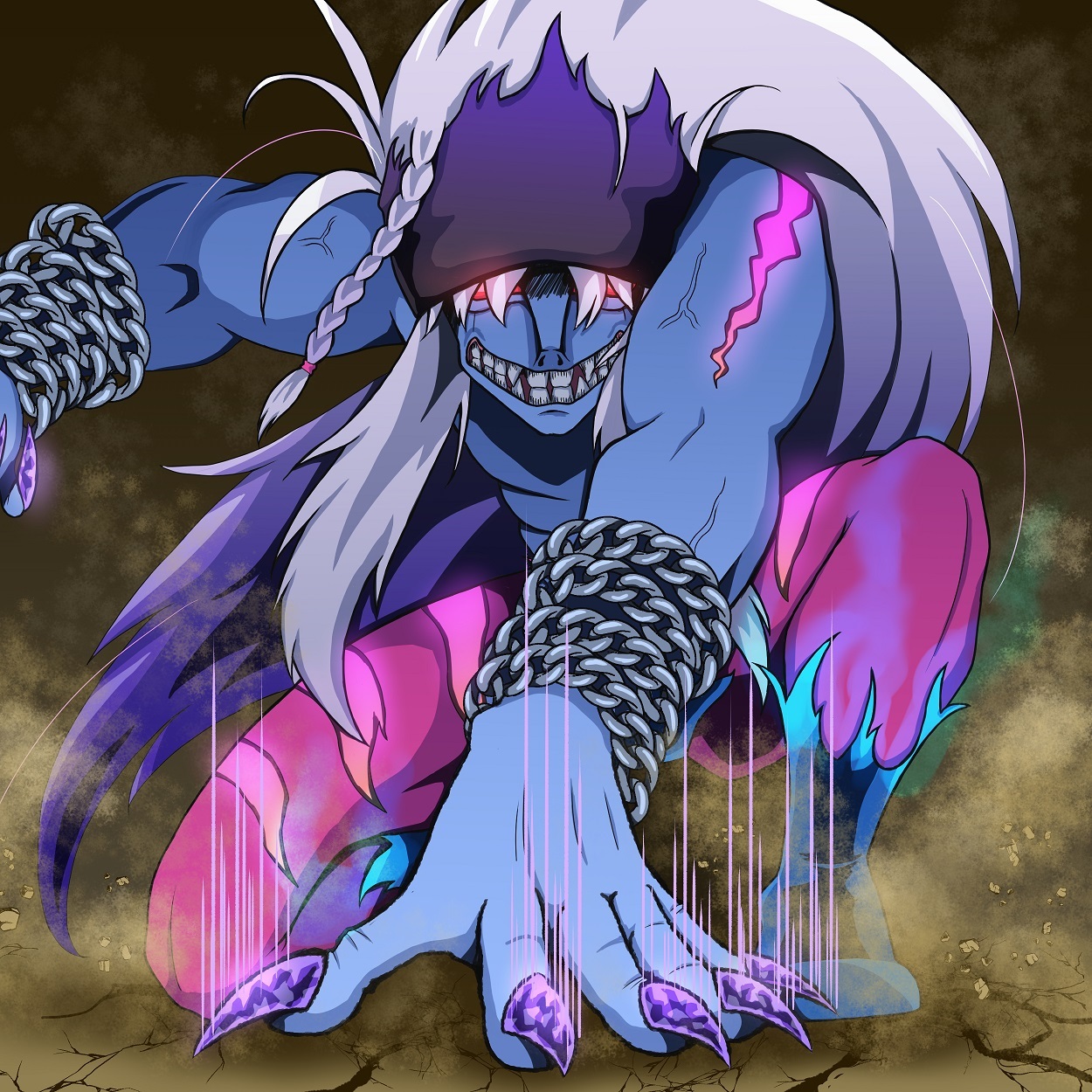 幽鬼のように青白い肌。夜叉のように荒々しい銀の毛髪。両腕には鎖が巻かれ、その手の先には毒々しい紫色の鉤爪が、ナイフのように鋭くとがっている。まるで空想の怪物が具現化したかのような風貌の大男が、さっきまで少年がうずくまっていた所に立っていた。