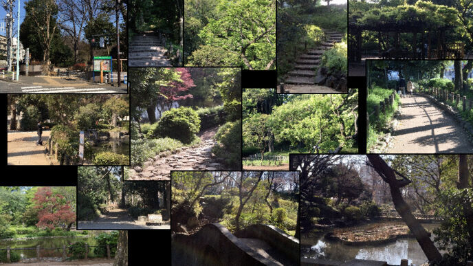 広尾駅からいちばん近い、南西の入口から入ったところが池のある庭園になっていて、そこから広場のある東側の高台に向かって大きく傾斜している。