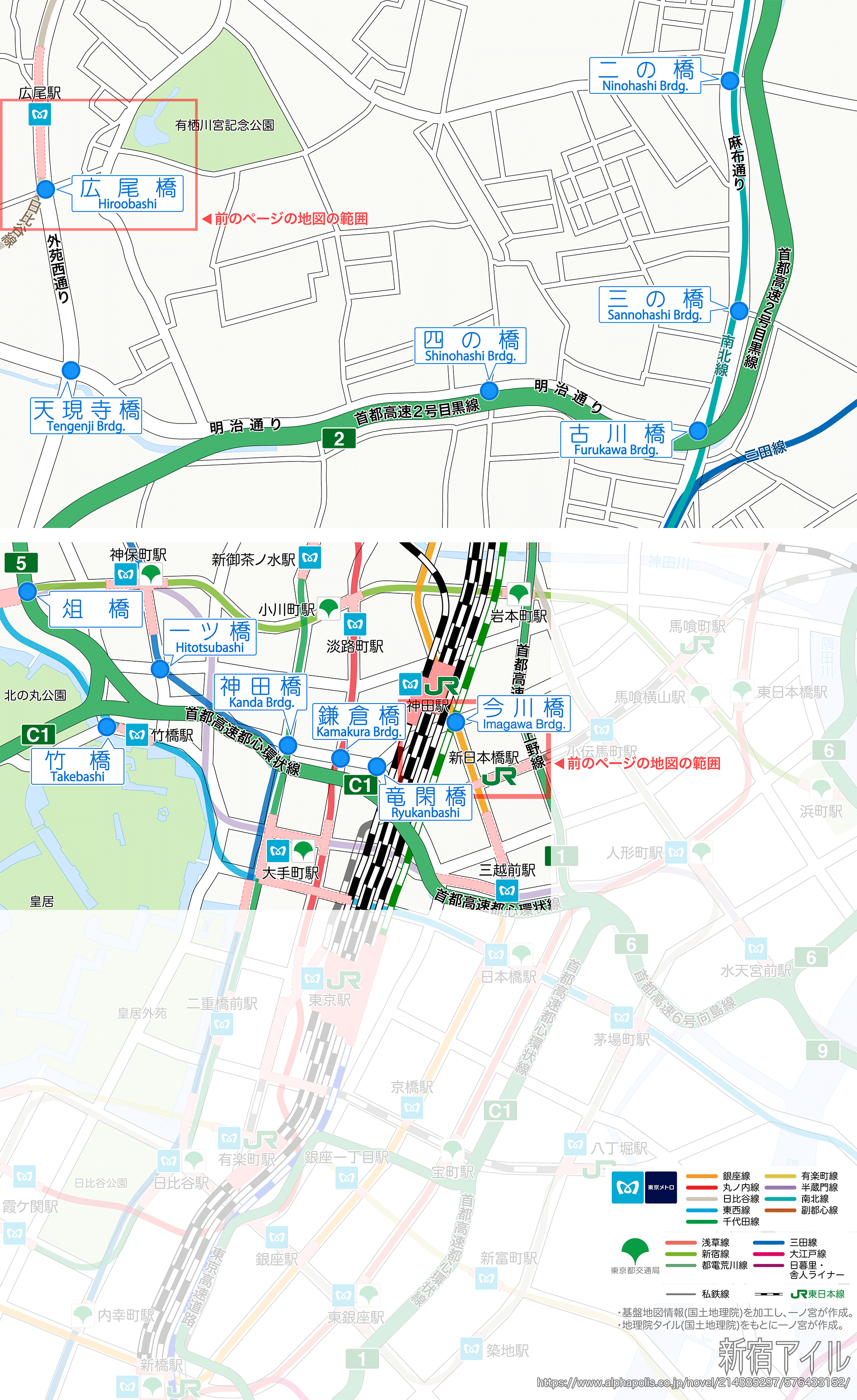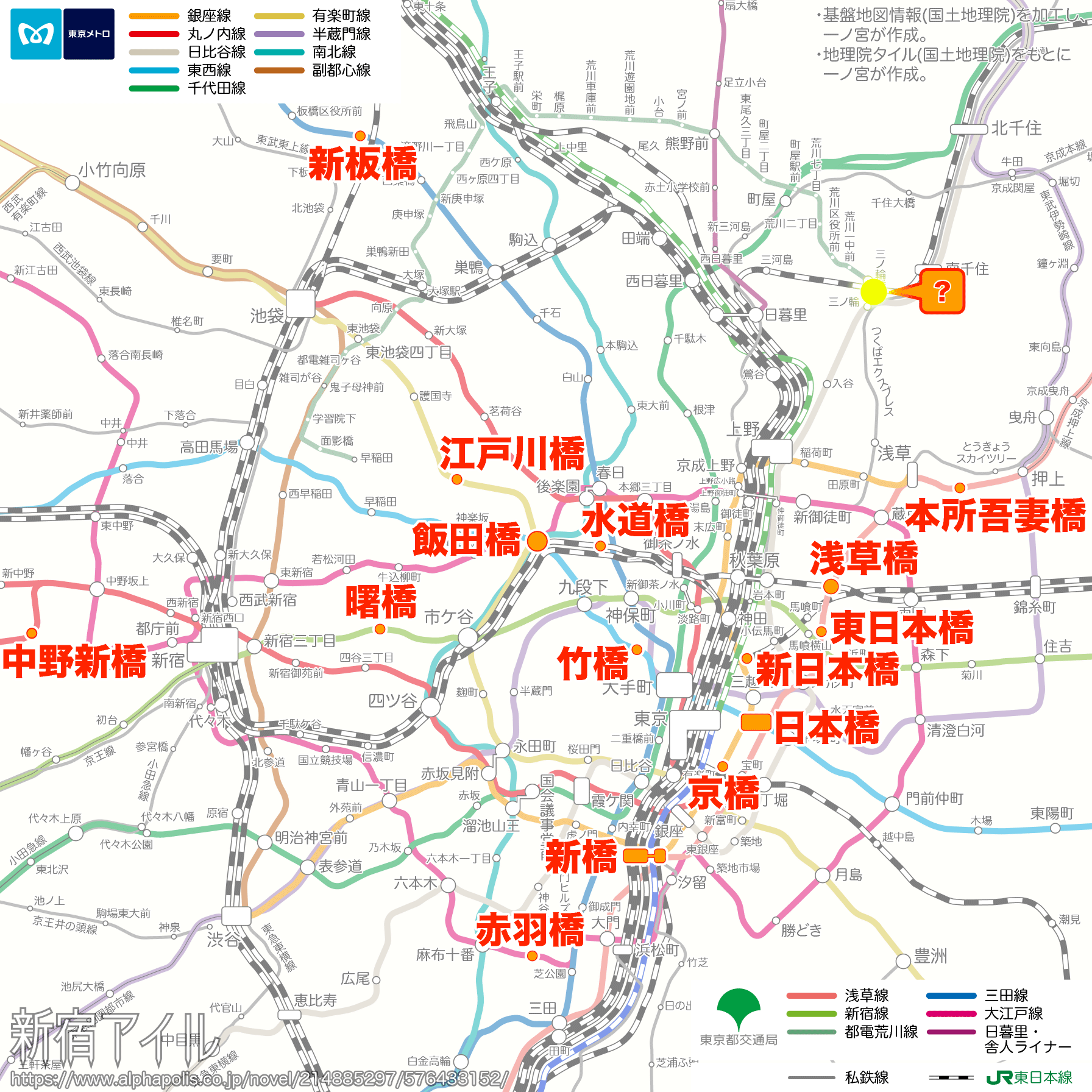 水道橋駅、曙橋駅、日本橋駅、京橋駅、竹橋駅、新橋駅、赤羽橋駅、浅草橋駅、本所吾妻橋駅——。