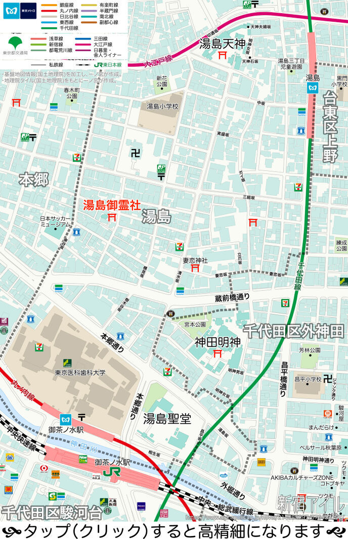 西は本郷、駅と神田川を挟んで南は千代田区神田駿河台、東は外神田——わかりやすくいえば秋葉原、北から北東は台東区池之端・上野に接する。